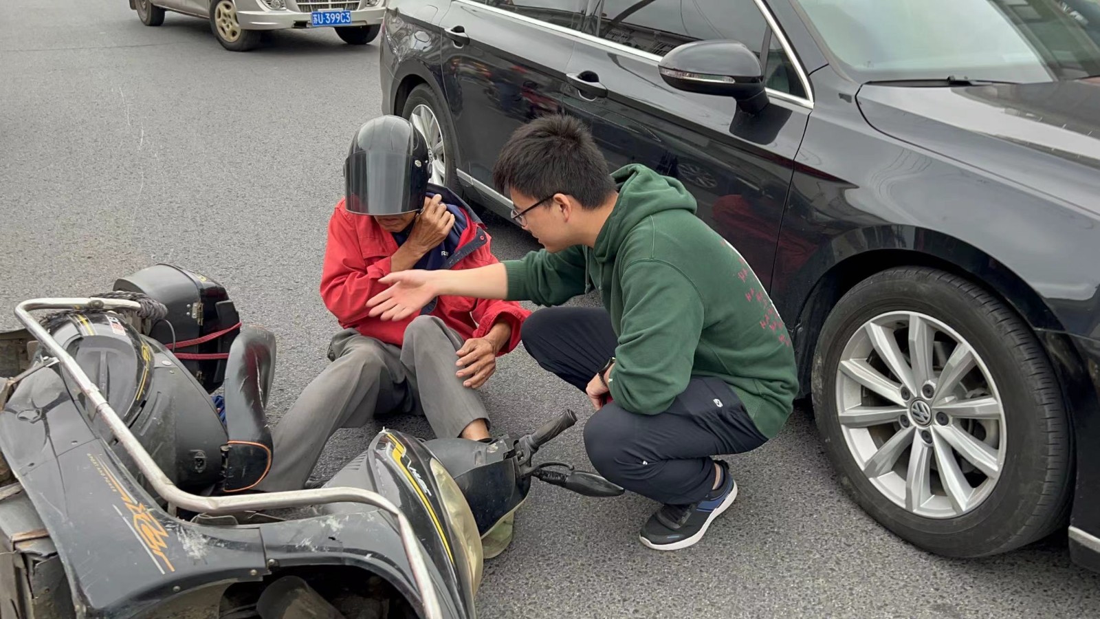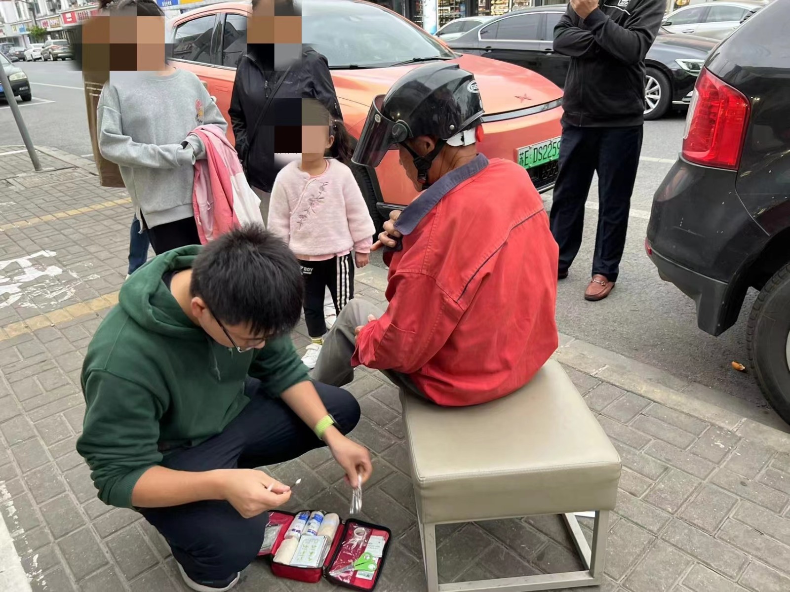 当天下午,苏州科技城医院医师周振飞带着妻儿准备前往老家吃晚饭,路过湘城集贸市场附近时,看见有一辆电瓶车被汽车碰撞倒地。周振飞马上反应过来,立即靠边停车,拿下随车的红十字急救包和妻子一起跑向伤者。确认现场已有人报警,经过初步判断后,他们把伤者扶到路边,周振飞为伤者的伤口进行了消毒处理。由于伤者除擦伤外并无明显的外伤,他们一起等待交警到来并嘱咐伤者要去医院进一步检查后,便带着孩子离开了现场。