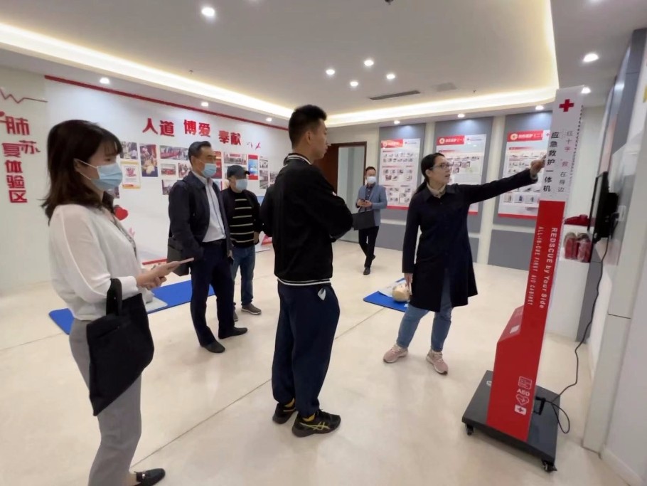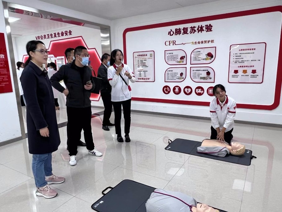 随后,调研组一行到无锡太湖学院参观生命健康安全体验馆。无锡太湖学院生命健康安全体验馆集知识性、互动性、趣味性于一体,有红十字知识体验区、应急救护体验区、消防安全体验区、地震安全体验区、交通安全体验区、人体健康体验区、综合安全VR体验等7块功能体验区。调研组一行实地进行体验,并与校方就场馆运行模式、建设想法、软硬件设施配备情况等进行了交流。