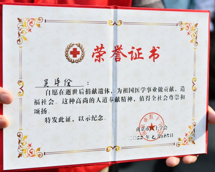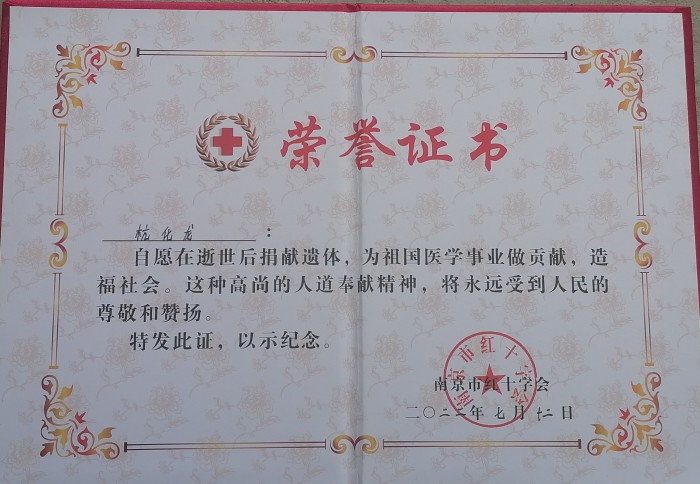 杨小飞介绍,近几年来,溧水区一共捐献遗体10位,捐献器官、组织18位,捐献年龄最大的97岁,最小的4岁,他们的大爱精神值得大家学习最后,杨小飞代表南京市遗体器官捐献者之友协会溧水分会及溧水区红十字会,向捐献家属表示深深的敬意