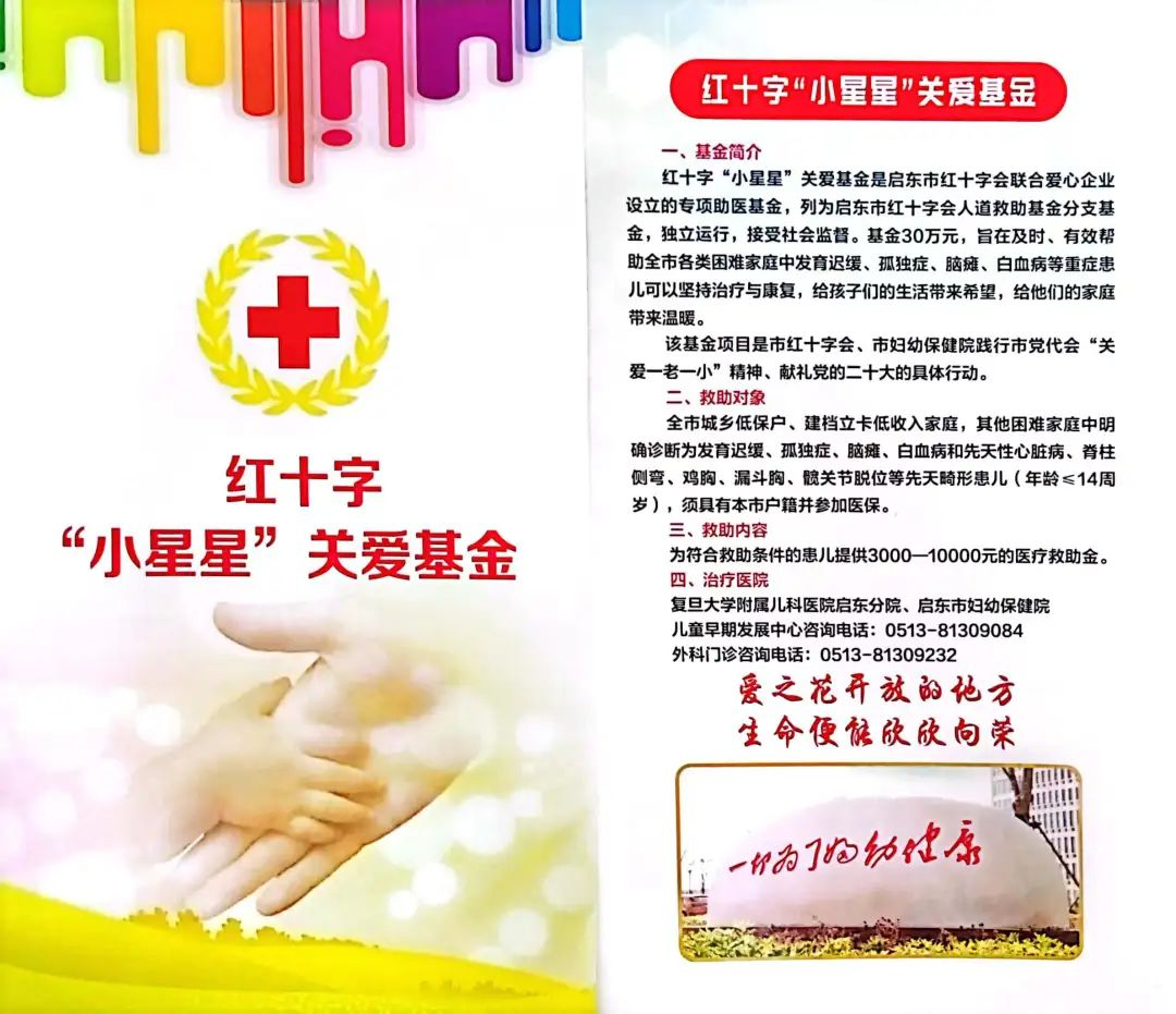 红十字“小星星”关爱基金是由启东市红十字会联合爱心企业设立的专项助医基金,列为启东市红十字会人道救助基金分支基金,独立运行,专款专用。