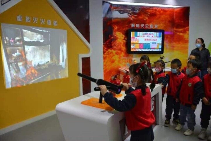 活动在一场消防演练中开始,9点整,随着警报声响起,在老师和志愿者的引领下,孩子们用湿毛巾捂住口鼻,沿着安全通道疏散到户外安全区域。演练结束后,小朋友们在社区志愿者的带领下参观科普馆,学习灭火器使用方法、了解厨房火灾应对方式。