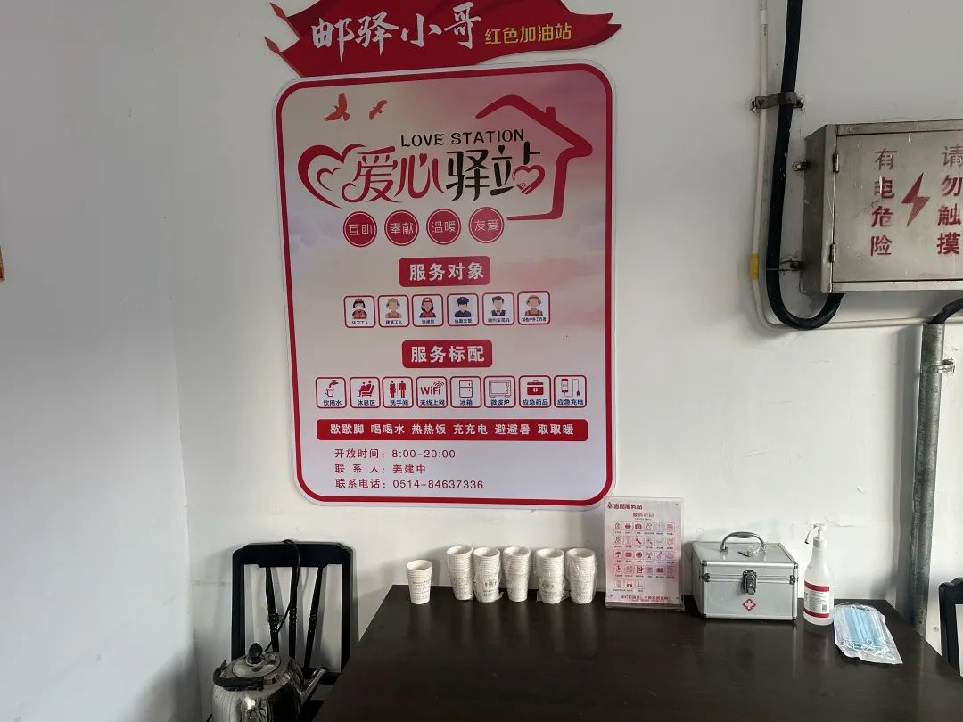 日前,高邮市北海社区博爱家园充分利用社区党群服务中心的阵地优势设立“邮驿小哥·红色加油站”,免费为快递小哥、外卖小哥、环卫工人提供“冷可取暖、热可纳凉、渴可喝水、急可如厕、伤可用药、停可充电”的24小时便捷贴心服务。