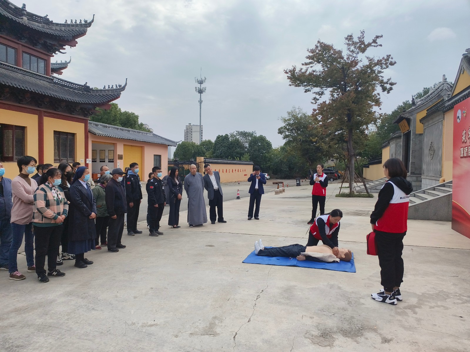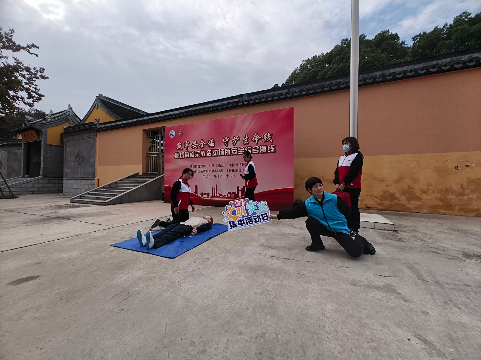 10月28日,惠山区堰桥街道红十字会在崇福寺联合开展“筑牢安全墙 守护生命线”安全综合演练。惠山区民族宗教事务局副局长刘军、堰桥街道党工委统战委员过宪裕、堰桥街道应急管理局局长胡寒晓出席本次活动。