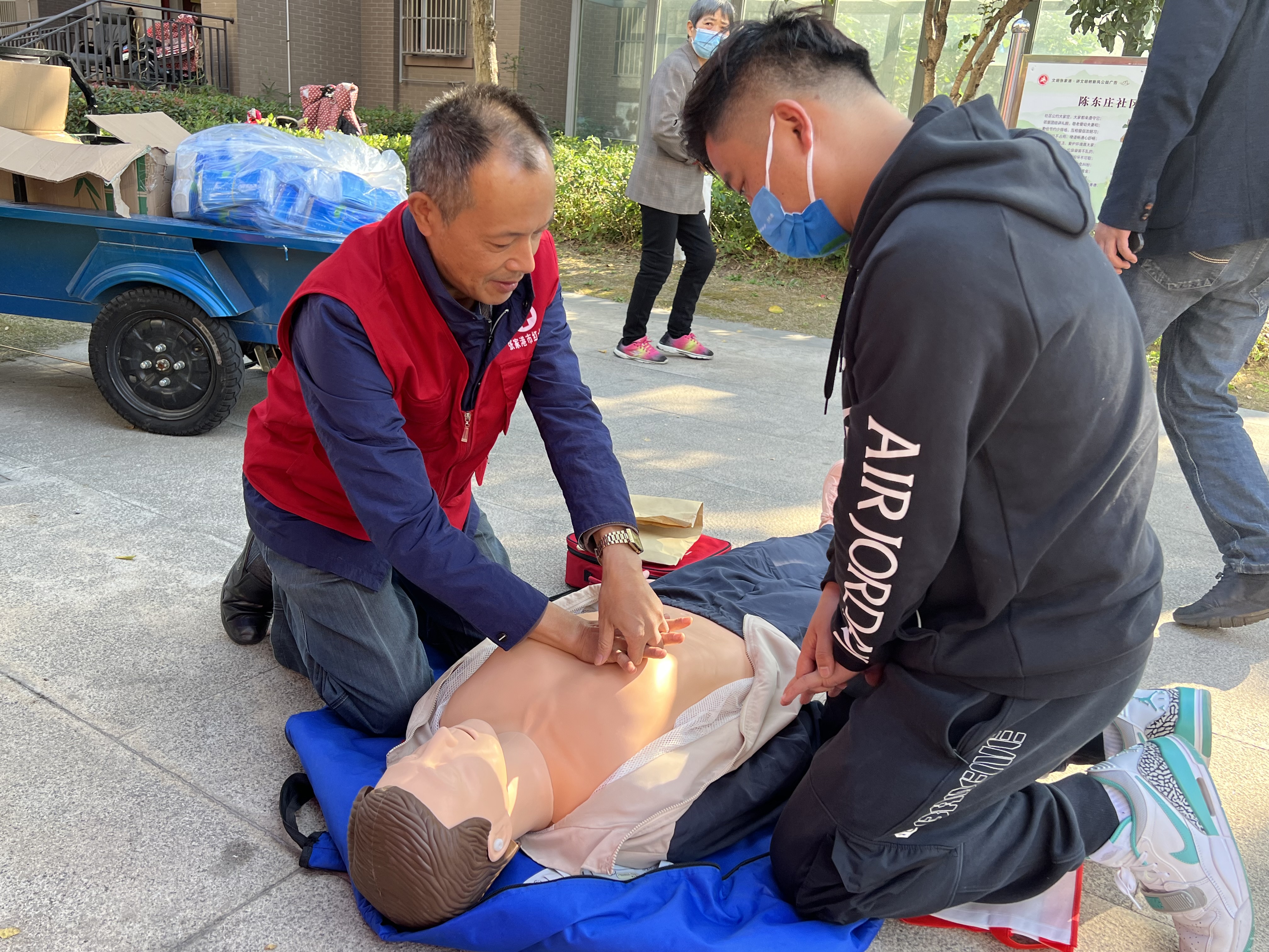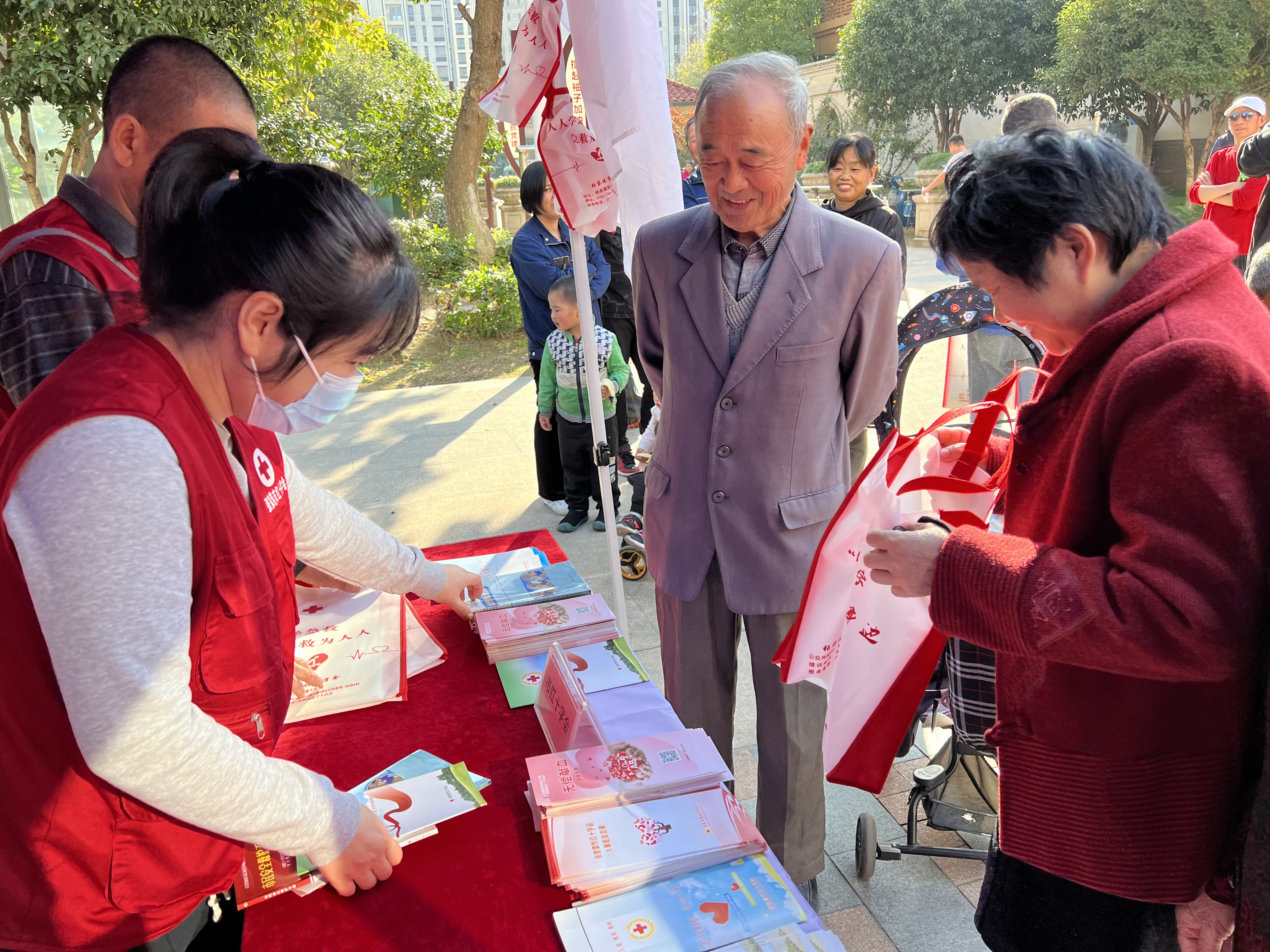 在市红十字会志愿服务点上,志愿者们热情洋溢,向过往的社区居民发放应急救护知识手册、造血干细胞捐献、遗体器官捐献、人道救助、红十字运动知识等宣传资料。救护培训师周继清耐心地向市民讲解面对心脏骤停患者时的急救措施和注意事项,手把手地指导他们现场操作。