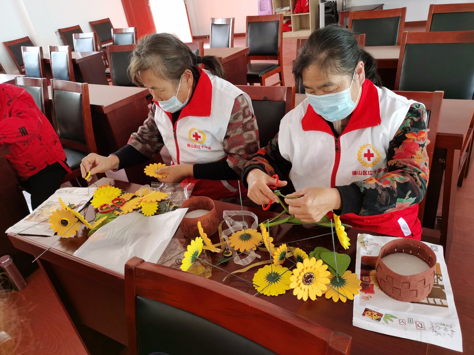 现场为老人们准备了三种不同的花:向日葵、小雏菊和太阳花。活动现场,红十字志愿者、社区工作人员先向大家展示成品盆花,然后讲解制作过程中的小技巧和注意事项。大家迫不及待地拆开手工材料包,有序地进行制作。首先,缝制花盆,并把填充的泡沫放进花盆里。随后是制作花朵,对于老人们来说,最复杂的是把花瓣插成花朵。整个制作过程,大家相互讨论,互相帮助,充分发挥各自的聪明才智,努力完成自己的作品。最后,每人都成功完成了作品,大家非常高兴,脸上洋溢着幸福的笑容。