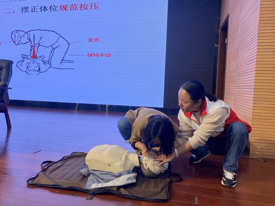 此次培训采用理论知识与实际操作相结合的授课形式,理论环节重点讲解了常见意外伤、常见急症、心肺复苏术、AED使用、创伤救护基本技能等内容。实践环节开展了心肺复苏急救技能的实操练习,使教师更深入地了解各项急救技巧、掌握急救要领。
