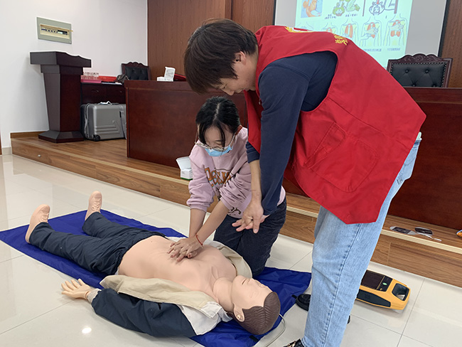 为使AED救护员们更深入地了解救护技巧,掌握心肺复苏要领,理论课程结束后,参训学员们共分成两组进行技能操作演练,老师现场指导纠错,确保动作规范、准确。学员们在“学+练”的教学方式中,初步掌握了应急救护的操作技能,提高了应对意外事故的处理能力和自救互救能力。