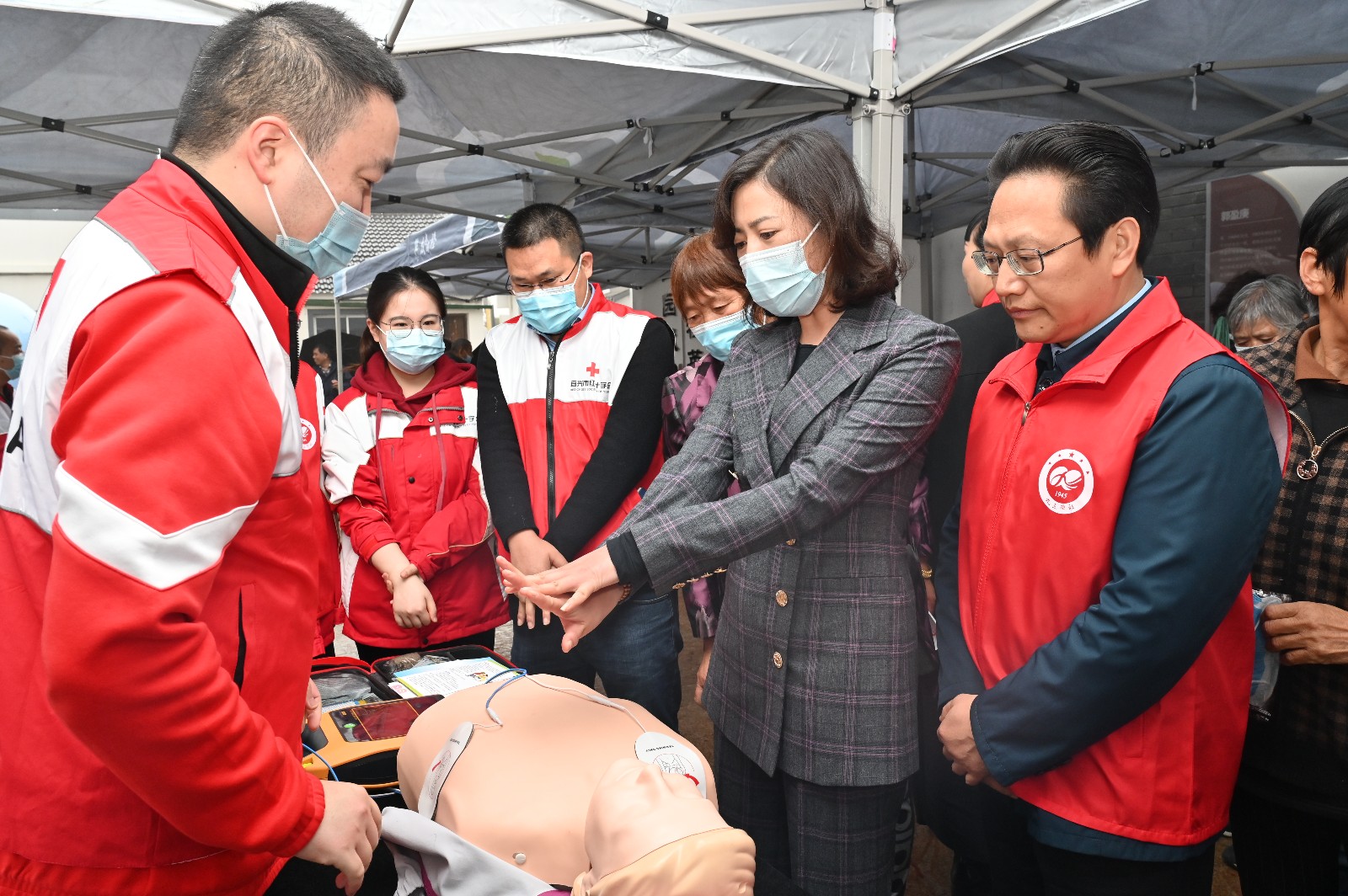 宜小红志愿者、宜兴市红十字应急救护培训师在现场发放宣传手册,并进行应急救护知识讲解和实操演练,展示心肺复苏和气道异物梗阻的正确救护方法,切实提高群众自救互救的意识和技能。