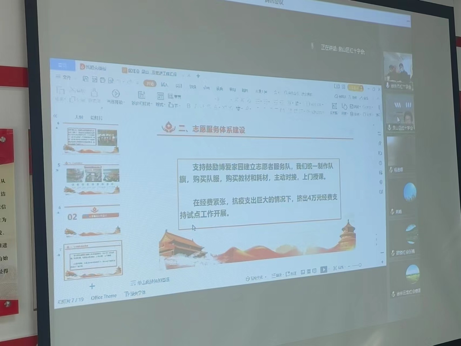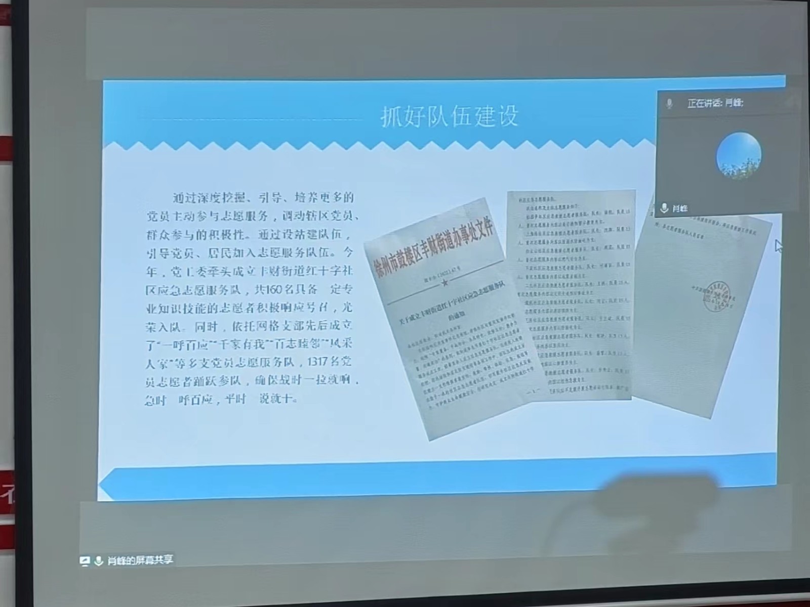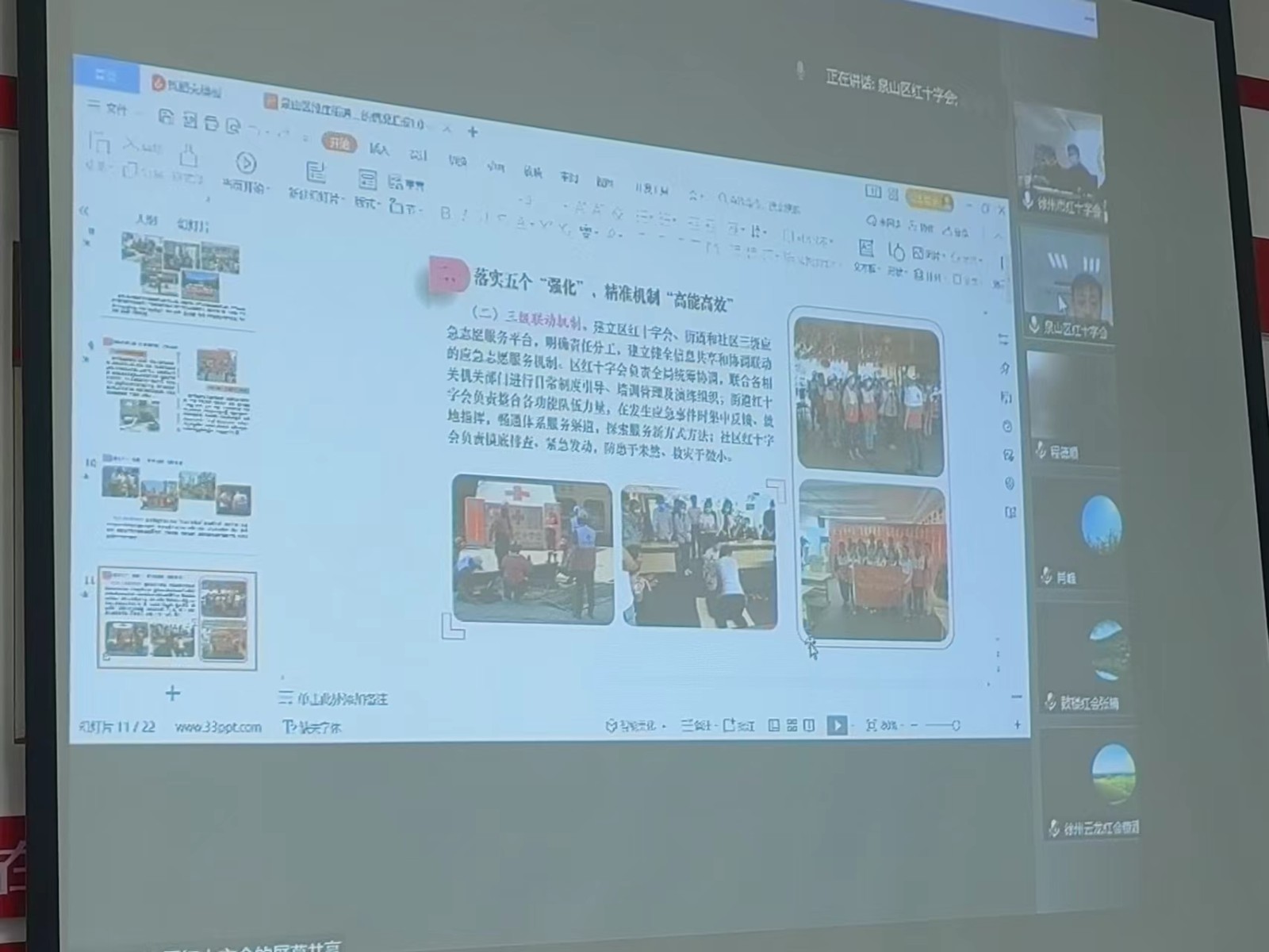 11月30日上午,市红十字会举行社区红十字应急志愿服务工作展示评审会。试点区红十字会、街道、社区负责人开展线上汇报。市委组织部、市文明办、市应急管理局相关处室负责人参加评审。市红十字会党组书记、副会长吴颖出席并讲话,副会长付跃云主持。