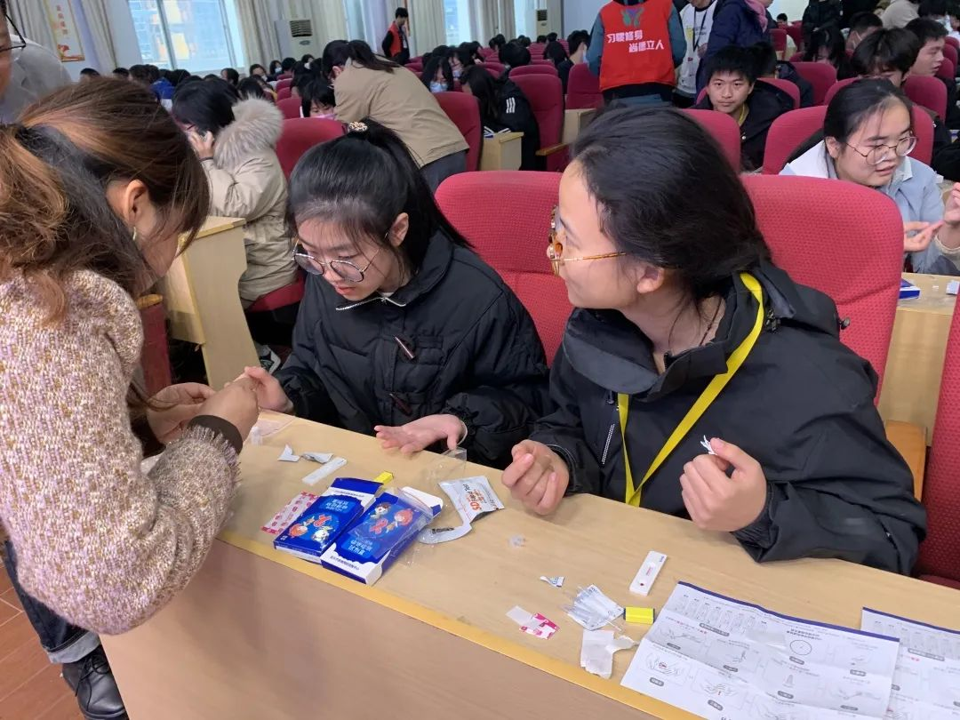 通过观看视频和老师们的现场指导,学生们了解艾滋病自主检测试剂的使用步骤与方法。