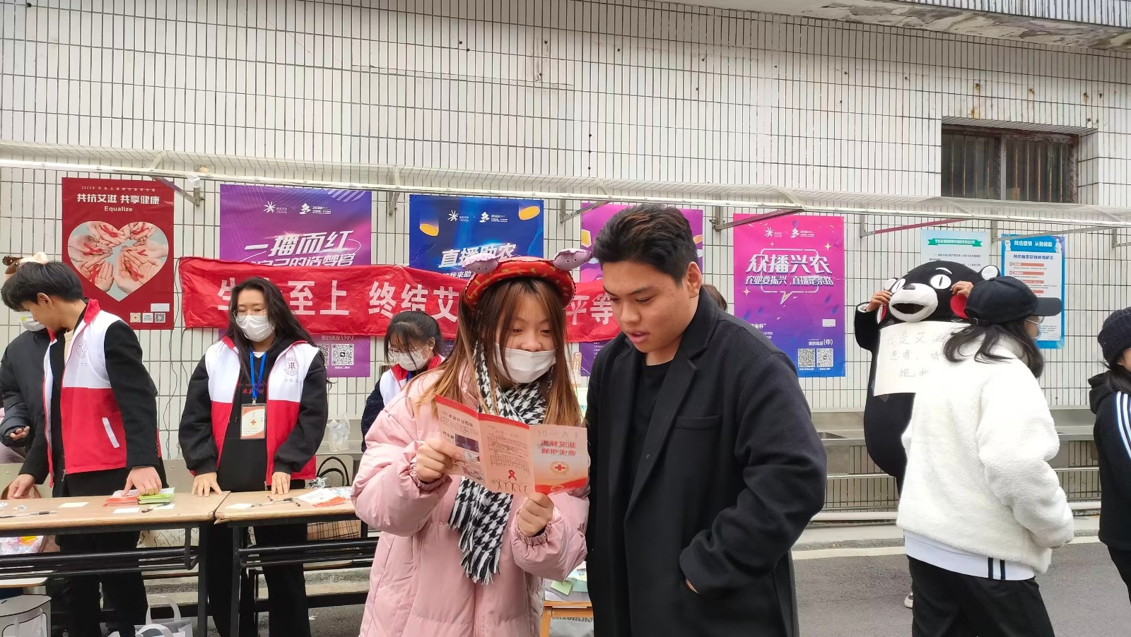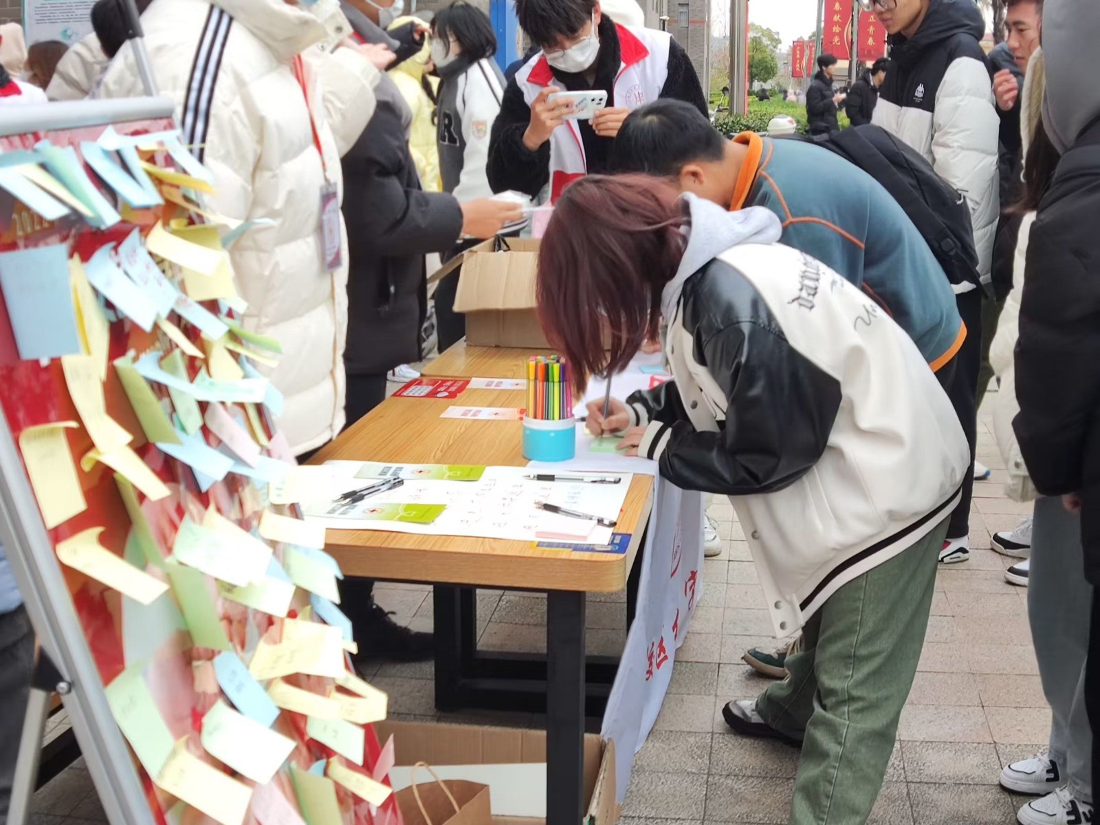 活动现场人头攒动,大家纷纷驻足停留。校红十字会发放了艾滋病知识宣传册,组织学生们现场组队绘画“红丝带”,对艾滋病患者进行美好祝愿爱心留言。众多师生积极参与,气氛热烈。