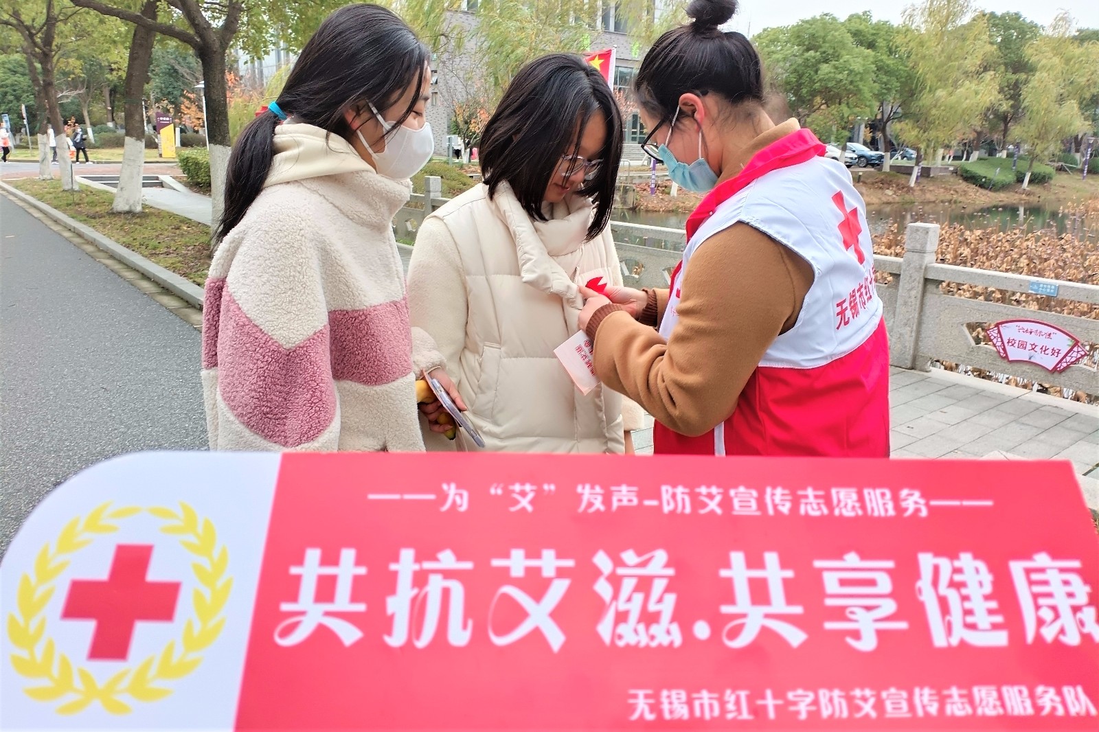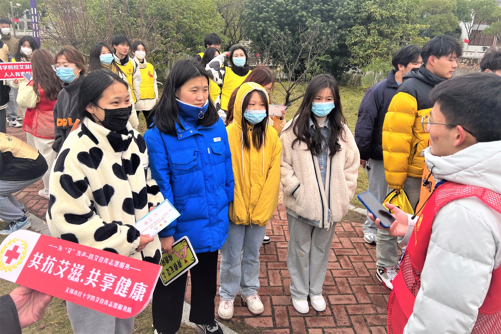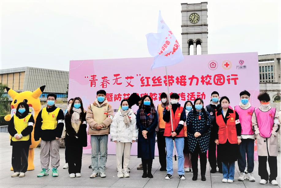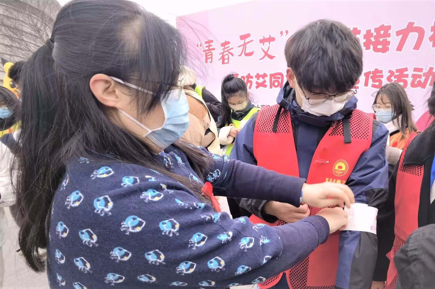 2022年12月1日是第35个“世界艾滋病日”,宣传主题为“共抗艾滋 共享健康”。为进一步遏制青年学生人群中艾滋病的传播和流行,促进青年学生身心健康发展,在无锡市红十字会、惠山区疾控中心的指导和万家惠家庭发展服务中心等社会组织的协助下,无锡城市学院团委联合校红十字会,在校举办了“青春无艾”红丝带接力校园行暨防艾同伴教育宣传活动。