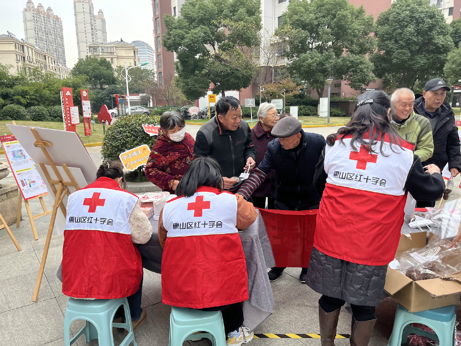 惠山区红十字会志愿者们早早地来到钱桥社区站头新村二期小广场上,布置好展板,活动现场,便开始向社区居民发放宣传折页,宣讲防治艾滋病的相关知识,并向群众积极倡导关爱、反对歧视艾滋病人,做自身健康的第一责任人,呼吁大家共同肩负起防艾抗艾的使命与责任,共抗艾滋、共享健康。