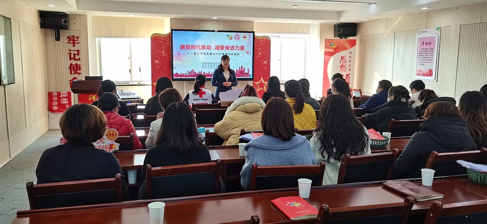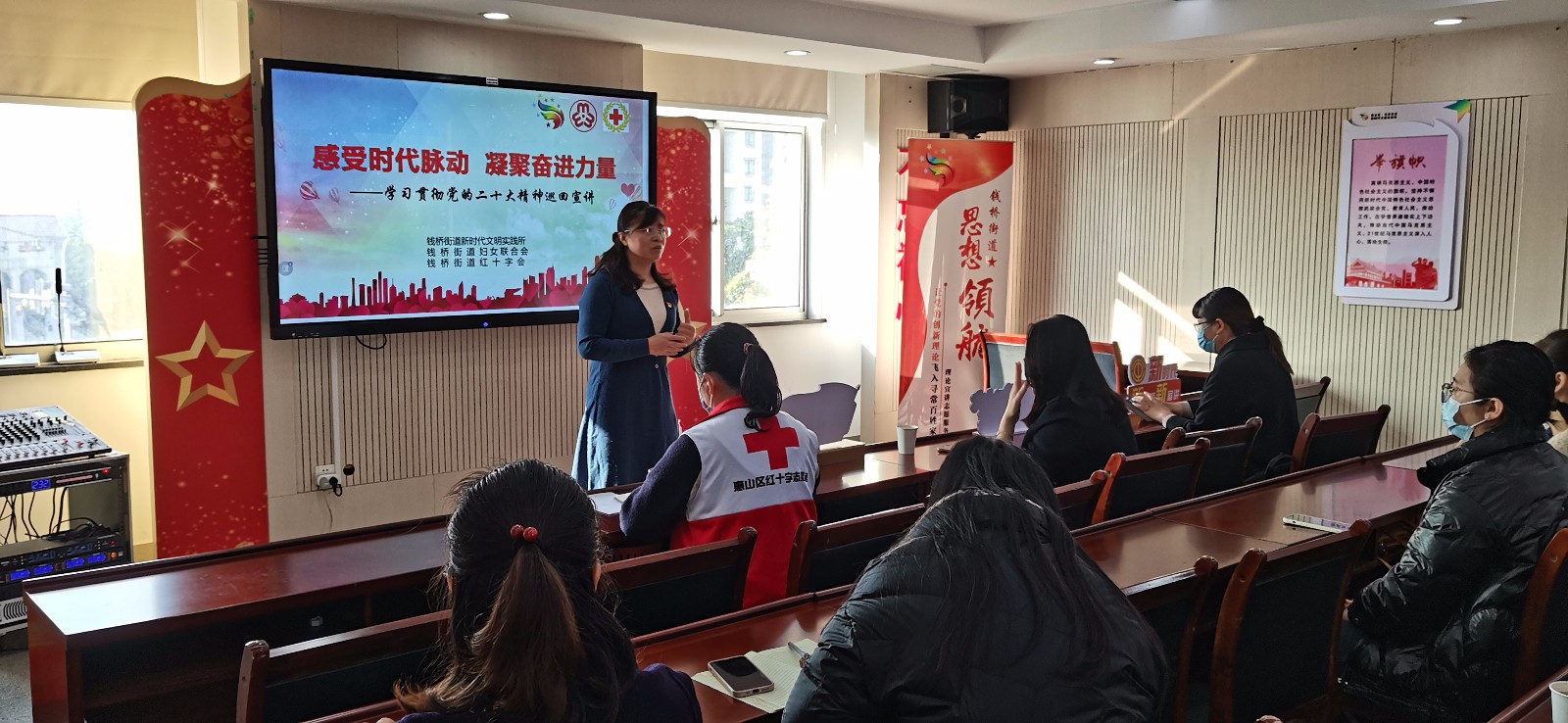 为深入学习宣传贯彻党的二十大精神,12月6日上午,惠山区钱桥街道红十字会联合街道妇联组织举办了党的二十大精神学习宣讲活动。活动邀请街道新时代文明实践所负责人、街道党校副校长周明霞为社区红十字专管员、妇联干部和巾帼志愿者代表作专题宣讲。