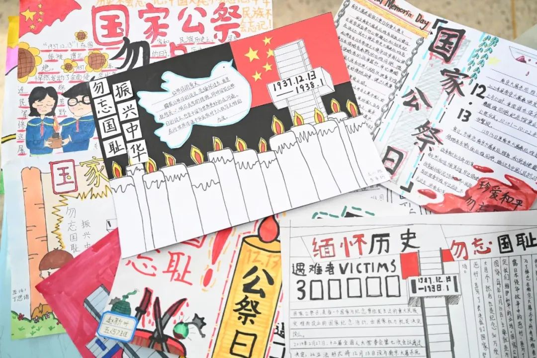 各中队进行了“勿忘国耻 圆梦中华”主题队会。队员们利用自己搜集、掌握的资料,交流、介绍了南京大屠杀这一惨痛的历史真相,牢记中华民族历史上那段苦难经历。队员们以“勿忘国耻,吾辈自强”为主题,结合社会主义核心价值观主题教育,通过绘制手抄报缅怀南京大屠杀无辜死难者,缅怀所有惨遭日本侵略者杀戮的死难同胞,缅怀为中国抗日战争胜利献出生命的革命先烈和民族英雄,希望全体少先队员牢记历史、勿忘国耻,激励队员们居安思危,奋勇向前,争做新时代好少年!