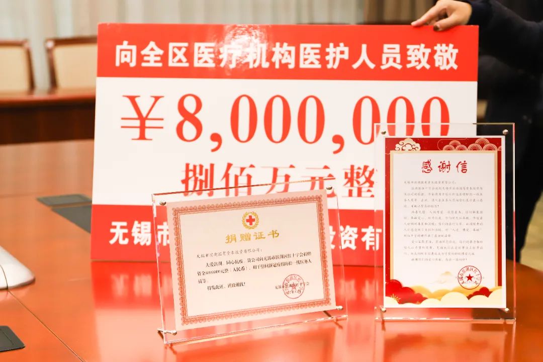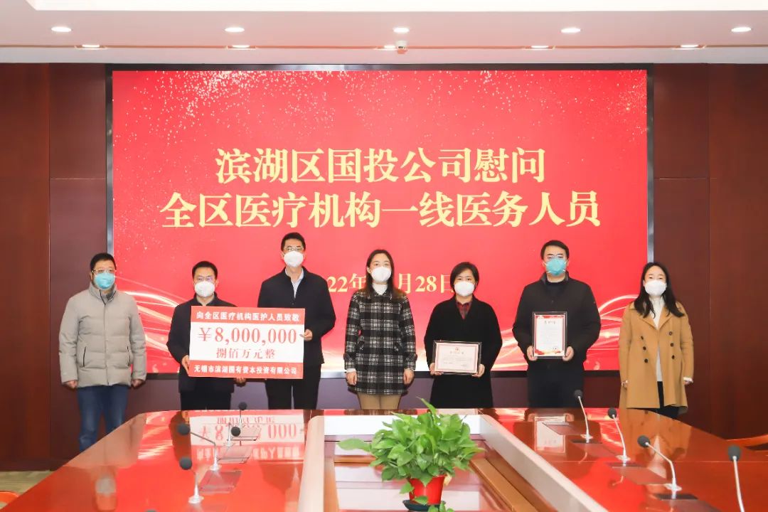 关爱白衣战士,助力医疗救治,彰显责任担当。12月28日,滨湖区国投公司通过滨湖区红十字会向无锡市第九人民医院、无锡市第二中医医院等医疗机构,捐赠总额800万元的慈善关怀帮扶慰问金,定向帮扶、慰问奋战在发热门诊、重点岗位等的一线医护人员,并向坚守在疫情防控、医疗救治最前沿的医护人员表达崇高敬意和慈善爱意。