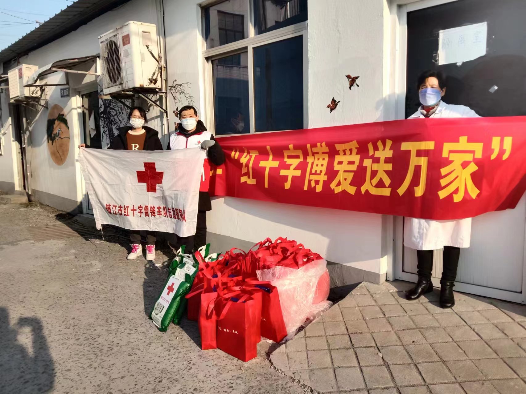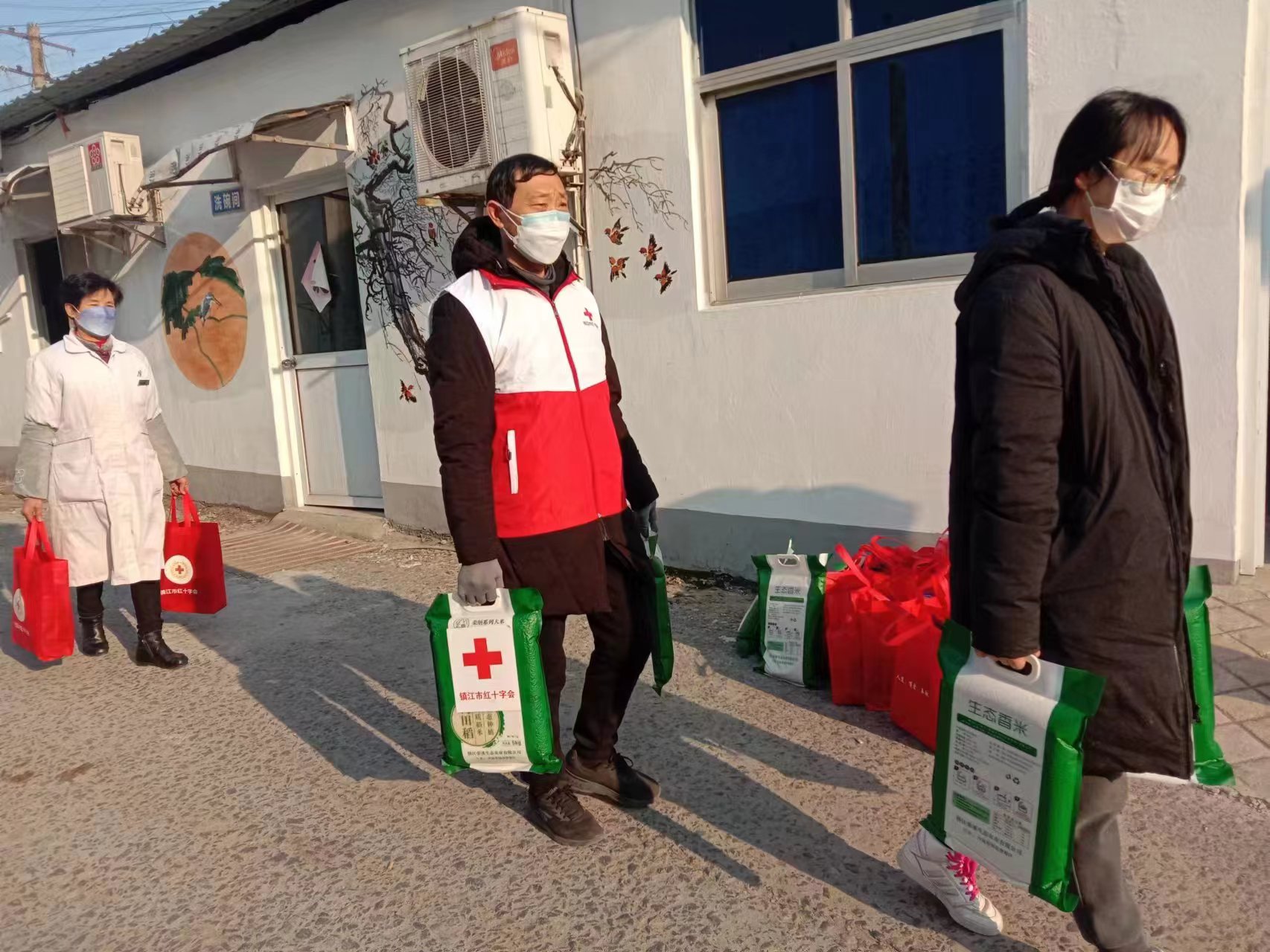 1月3日上午,镇江市红十字会雷锋车队志愿者们带着红十字博爱物资走进京岘山老年公寓,为老人们送上大米、温暖包、棉被等物资。