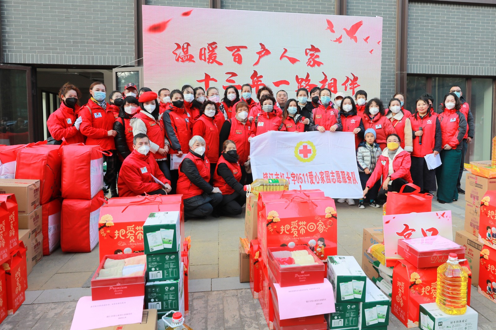 1月8日,红十字爱心家园志愿服务队在西津古渡社区举办“温暖百户人家,13年一路相伴”物资发放仪式,志愿者们为245户以残疾人为主的困境家庭送去大米、温暖包等物资,帮助他们过一个温暖的年。