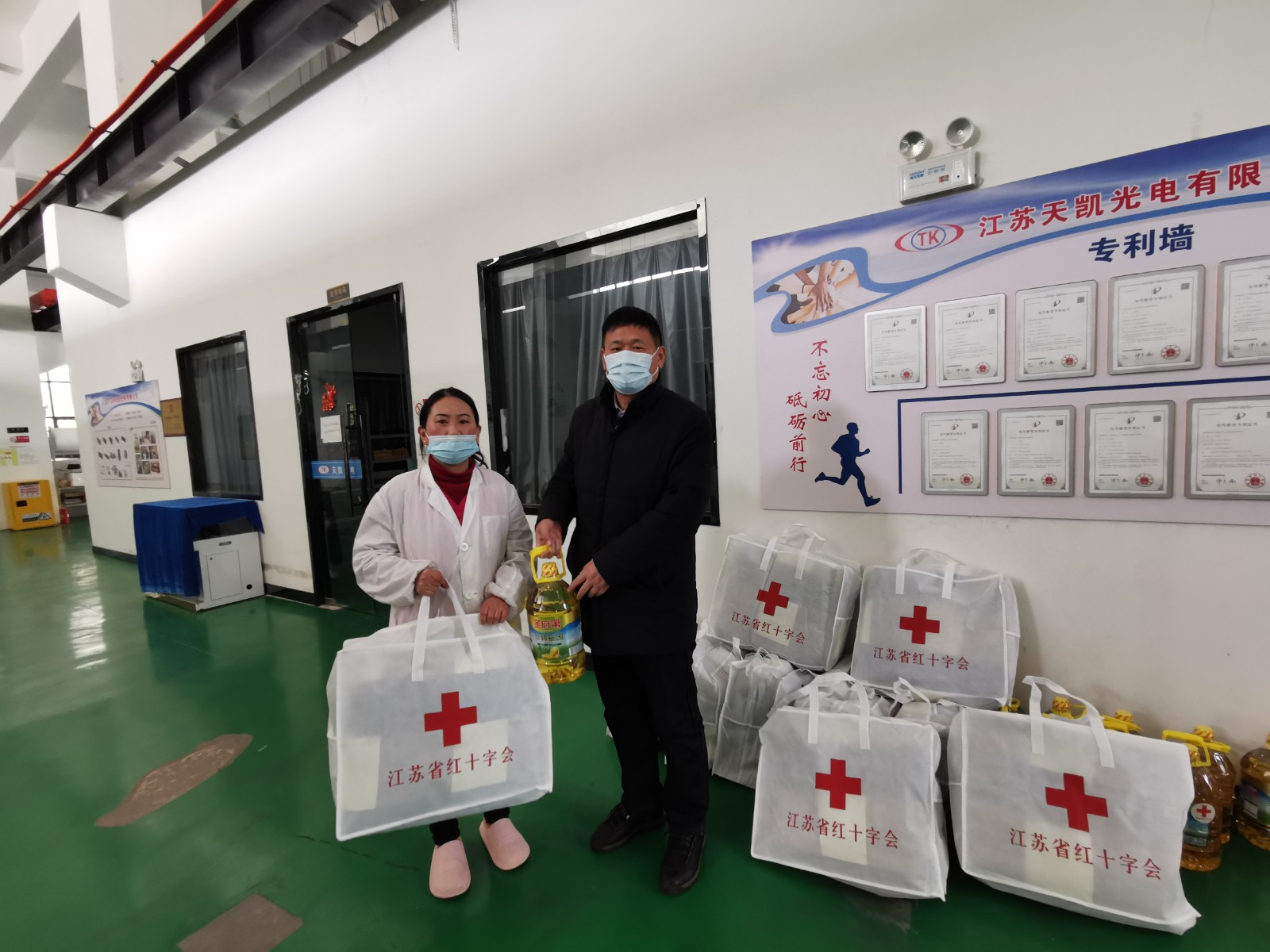 图为:1月13日,宿城区红十字会党组成员、副会长韩金带队前往挂钩帮扶的王官集镇王林村和江苏天凯光电有限公司进行新春慰问,并开展年终座谈活动。