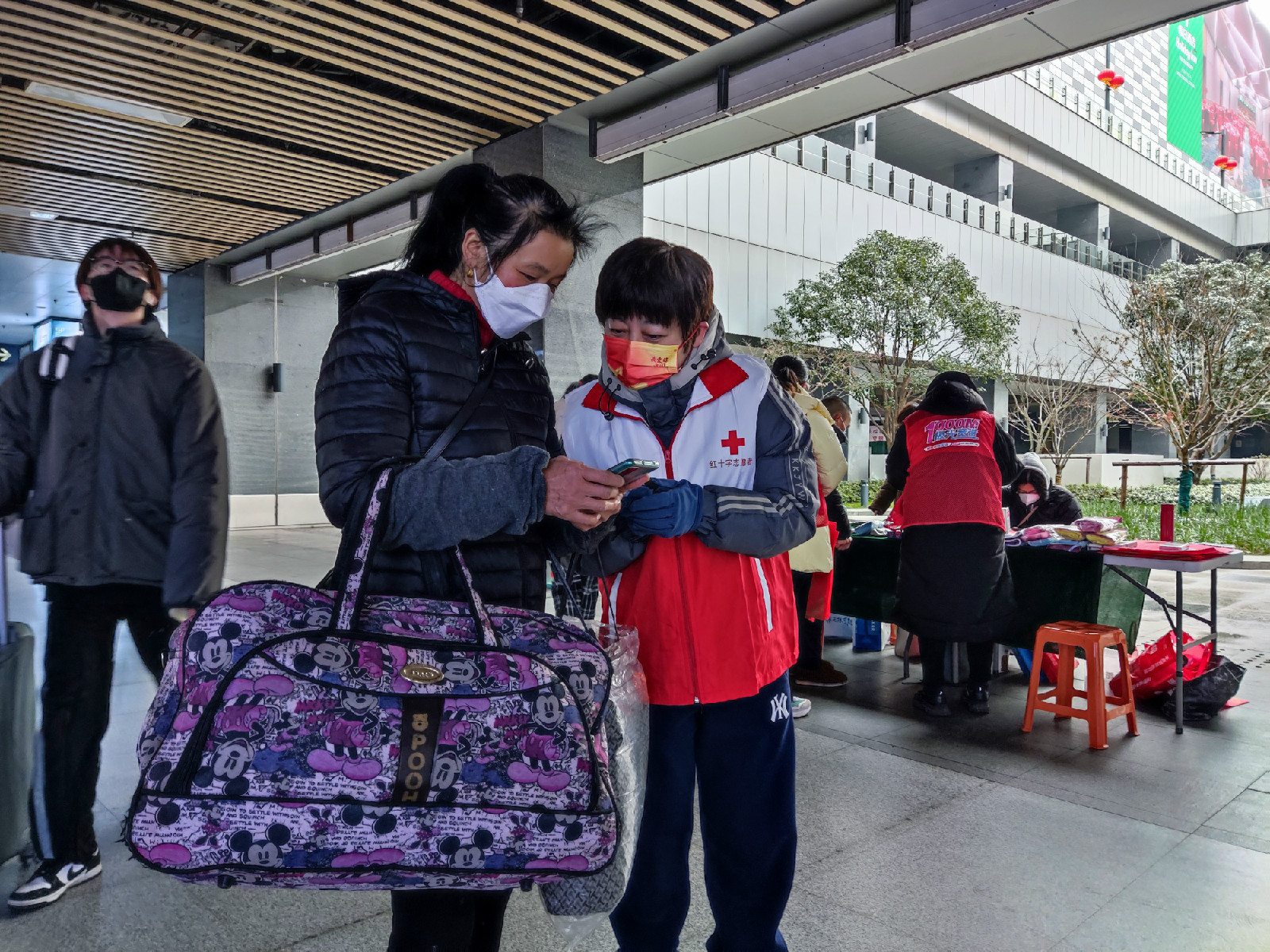 春运来临,无锡火车站旅客脚步匆匆踏入返乡归途,红十字志愿者用充满温情和年味的暖心活动,为旅客送去一份份博爱祝福。