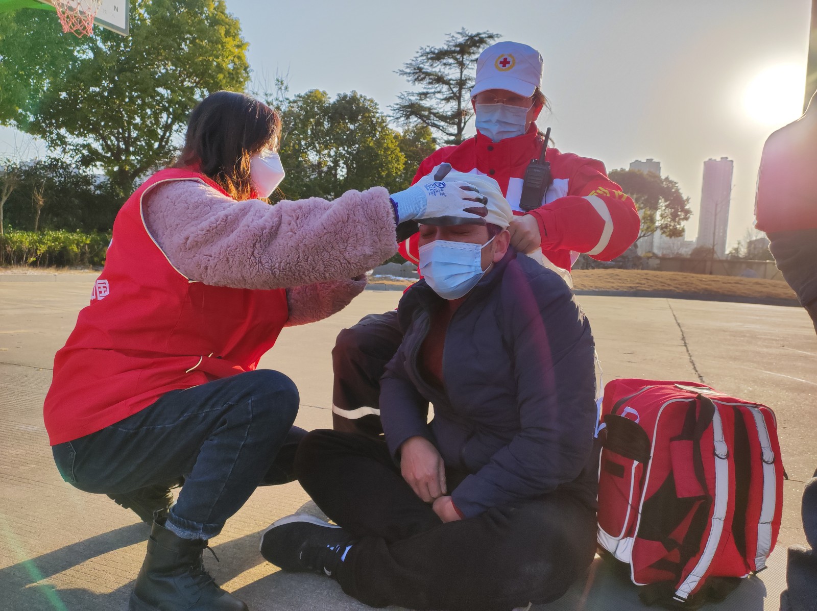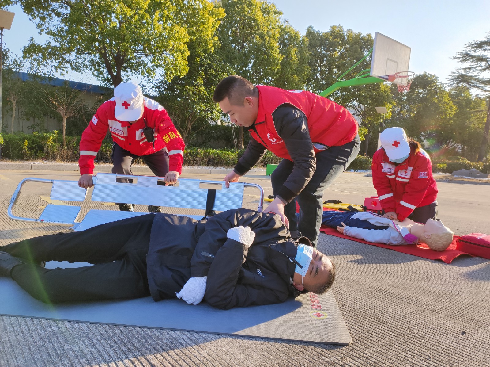 演练背景是临近春节,人员流动激增,易造成事故发生,市红十字会模拟某地事发现场,组织救援队积极参与救援。救援队员接到通知,迅速结合奔赴现场参与救援行动。根据现场情况设立赈济救援组和卫生救护组,赈济救援组到达现场立即搭建临时医疗点和生活帐篷,准备相关配套设施,组织开展群众安置和物资发放等工作;卫生救护组对现场伤员进行初步的检查,对部分伤员采取止血、包扎、固定和搬运等措施,对心跳骤停的伤员进行心肺复苏。通过队员共同努力,现场伤员得到及时救护和转移、滞留群众得到有效安置,整体救援工作有序开展,救援工作取得较好效果。