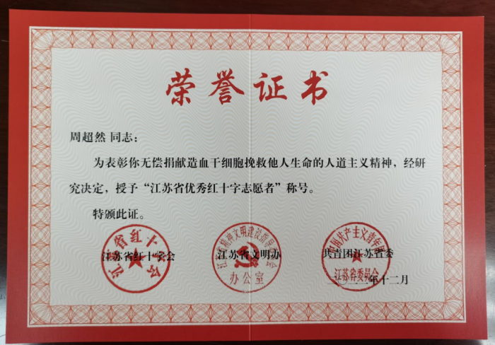 近日,省红十字会、省文明办、团省委联合发文,表彰2021年12月以来成功实现造血干细胞捐献的同志并授予“江苏省优秀红十字志愿者”称号。集团职工周超然同志获此殊荣。