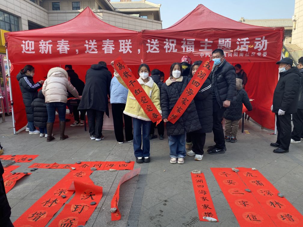 在2023年春节即将到来之际,为营造喜庆祥和的节日氛围,弘扬中华优秀传统文化,1月18日,向阳南社区博爱家园组织开展“迎新春,送春联,送祝福”志愿活动。活动现场,社区工作人员、学生志愿者和书法老师早早摆好桌椅,准备好红色的对联纸、毛笔和墨水。学生志愿者和书法老师倾情挥墨,一幅幅风格多样、祝福满满的春联和“福”字,为即将到来的新春佳节增添了浓浓年味。社区居民有序挑选自己喜欢的对联,或是请书法老师帮忙书写春联,学生志愿者还将春联送到辖区困难群众家中,居民们拿着一幅幅红火的春联,高兴不已,纷纷竖起大拇指为社区的暖心服务点赞。