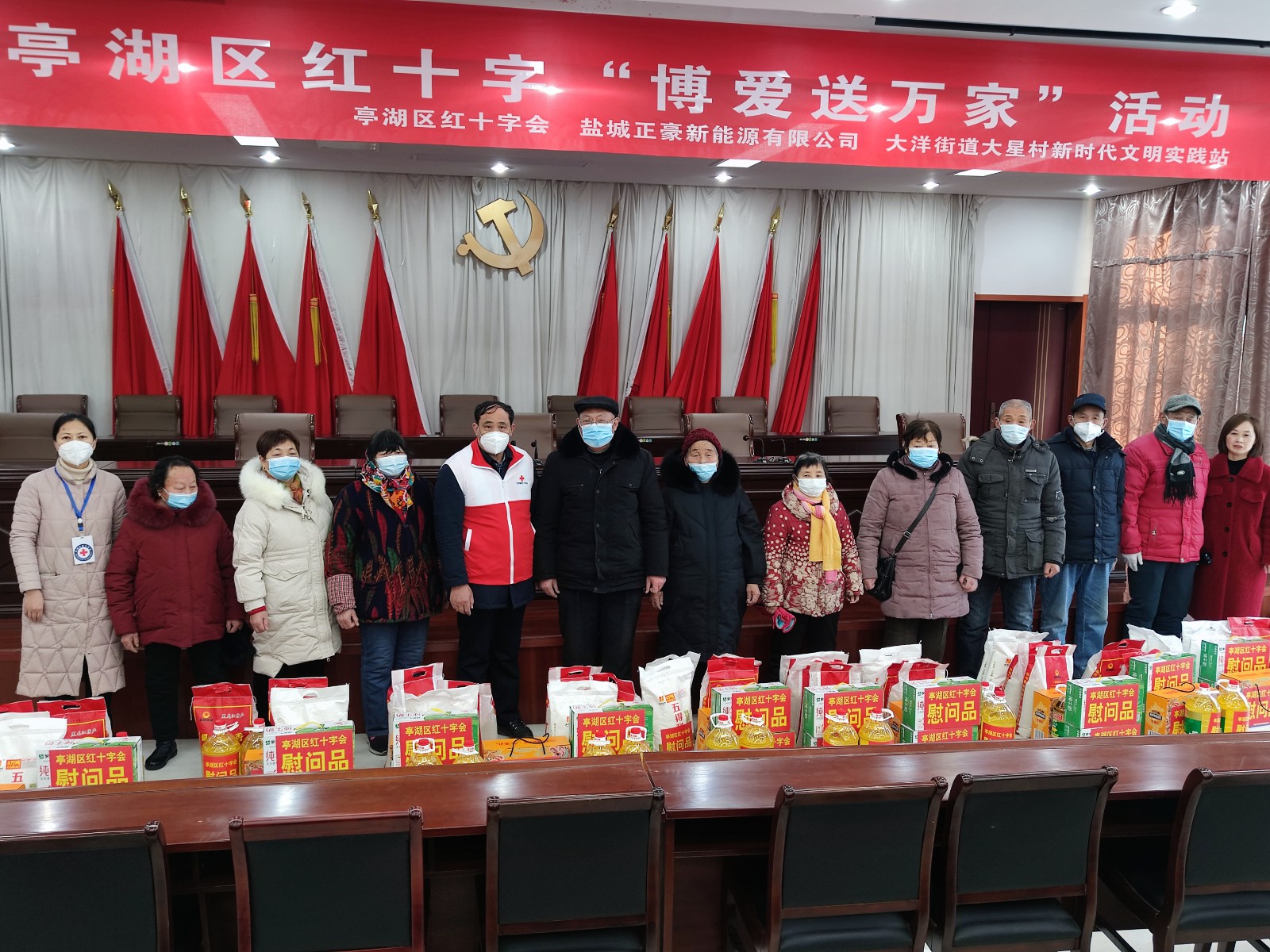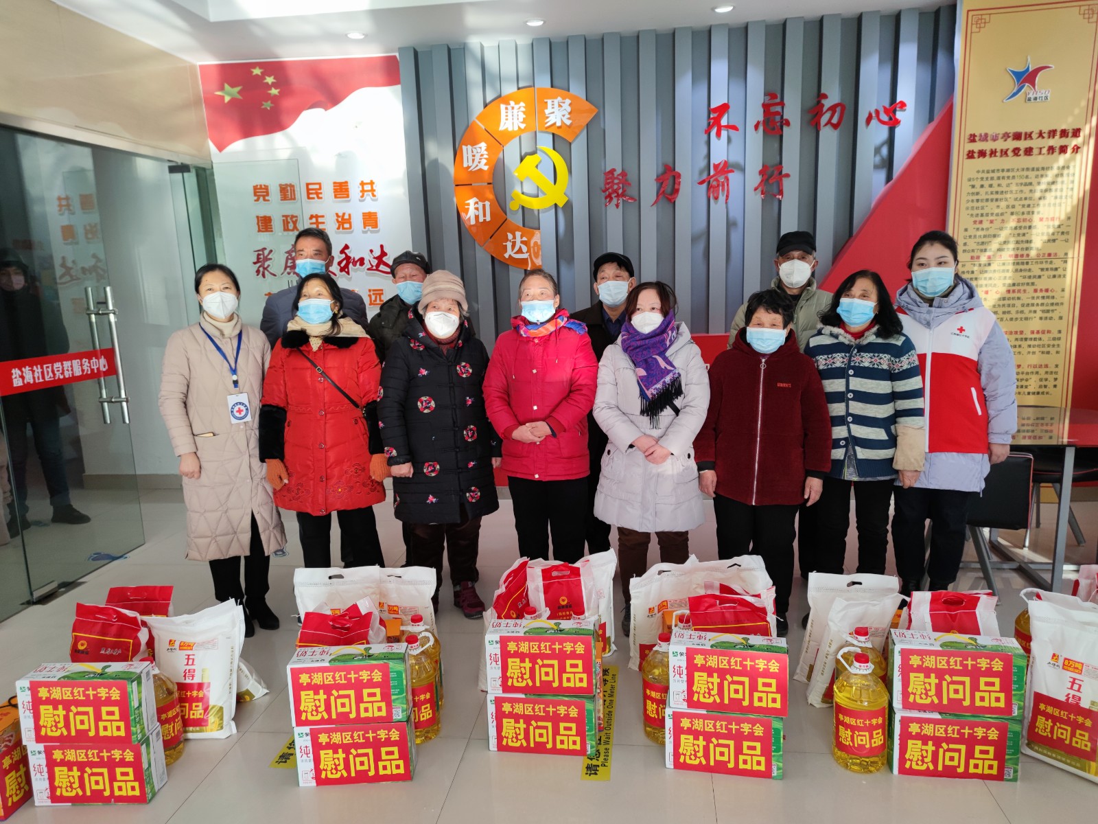 1月17日,亭湖区红十字会联合爱心企业走进大洋街道大星村和盐海社区,为困难家庭带来年货大礼包,为他们送上新春团圆的祝福。