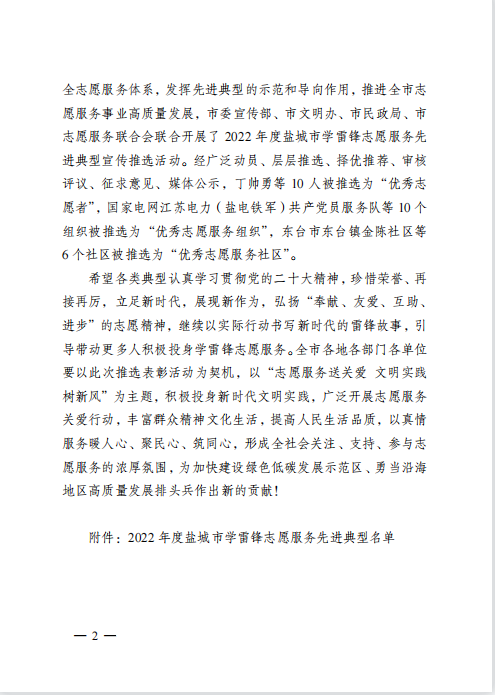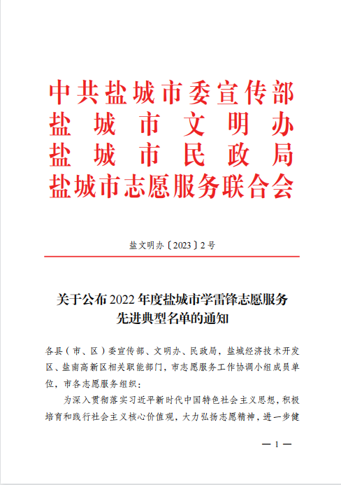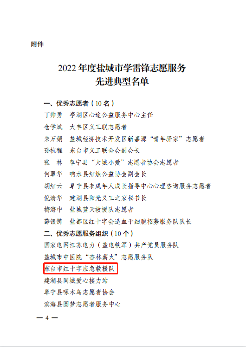 近日,由盐城市委宣传部、文明办、民政局、志愿服务联合会联合发布《关于公布 2022 年度盐城市学雷锋志愿服务先进典型名单的通知》(盐文明办〔2023〕2 号),东台市红十字应急救援队在列,是盐城红十字系统唯一获此殊荣的“优秀志愿服务组织”。