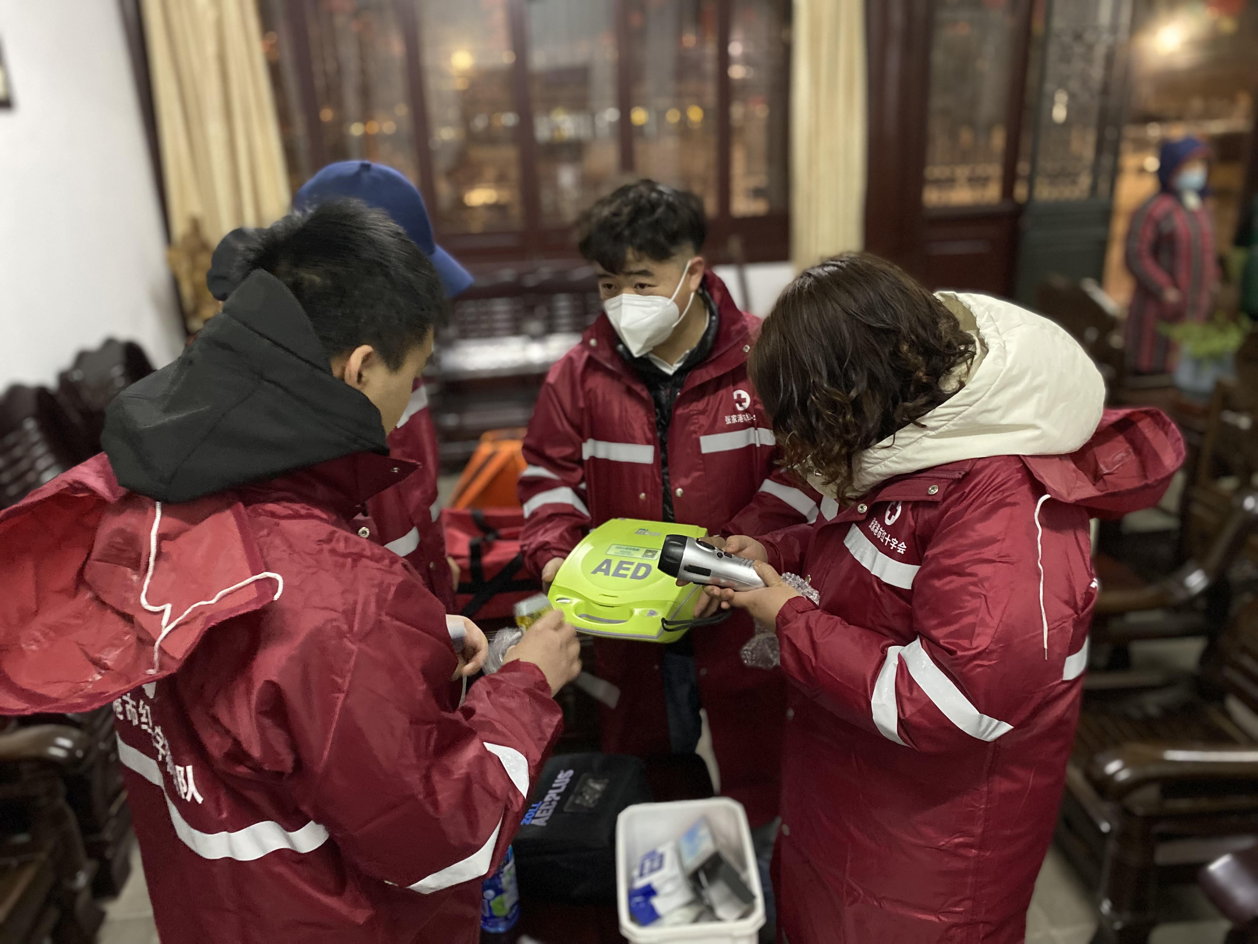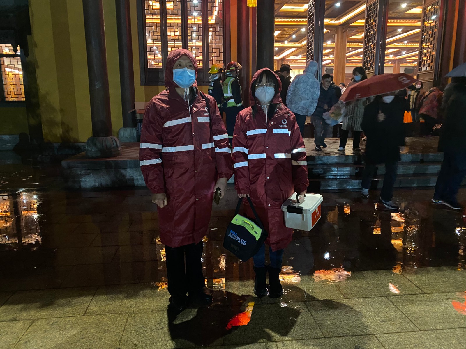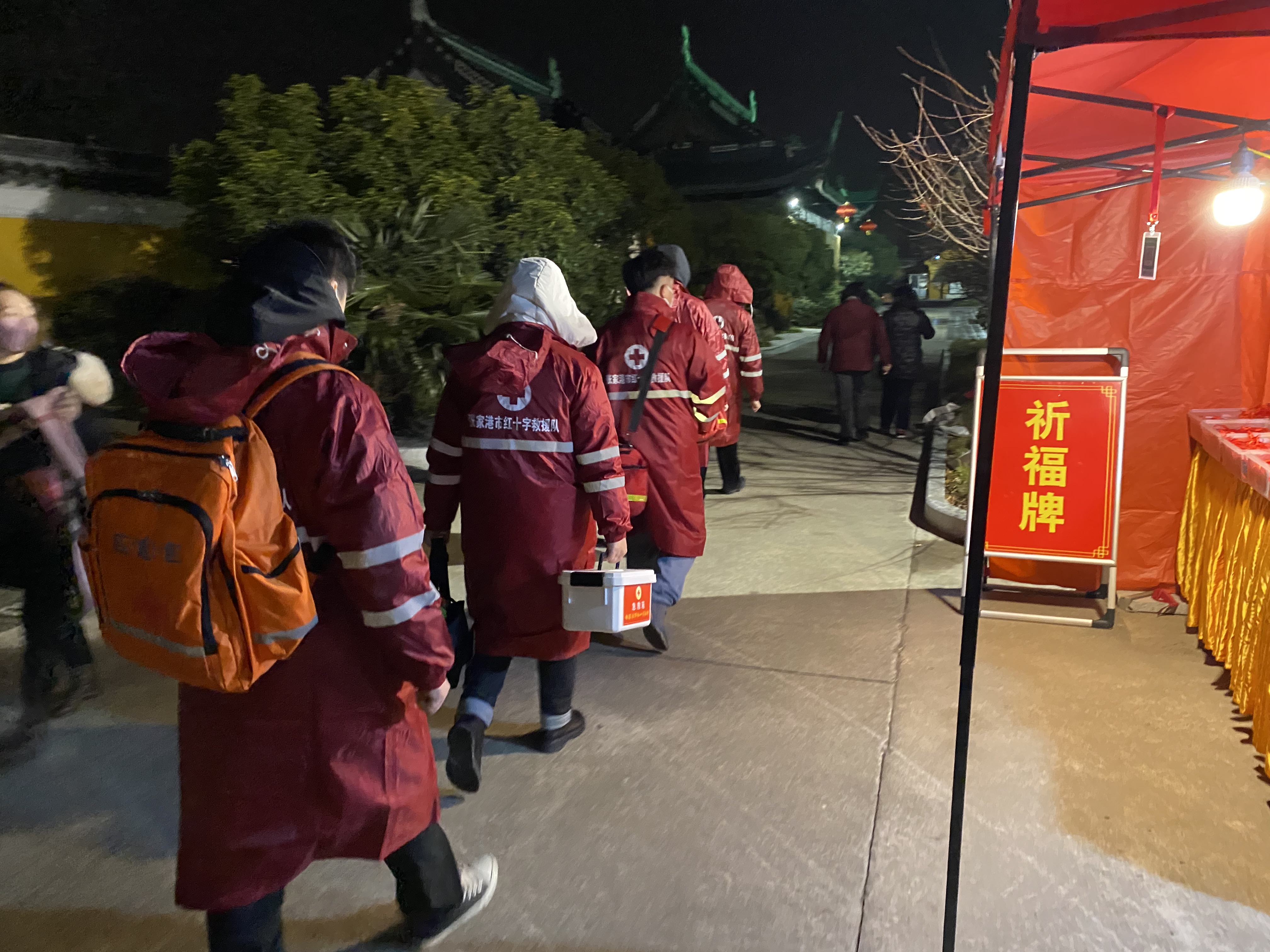 1月21日,除夕夜,冬雨绵绵,市红十字救援队6名队员集结在河南庙,考虑到初一零时开始,广大群众到寺庙敬香祈福,在这期间人流量大,救援队携带好急救箱、急救包、AED等救援装备,在寺庙里巡逻备勤,及时提醒游客注意安全。凌晨1点半,气温骤降,随着游客逐渐减少,应急保障任务画上圆满的句号。