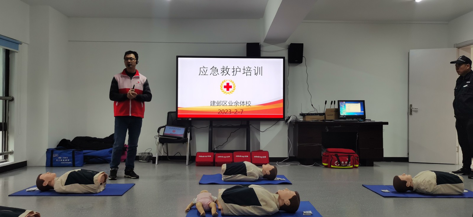为进一步加大社会公益性应急救护培训普及力度, 2023年2月7日上午,南京市建邺区红十字会在建邺区业余体校邀请红十字会注册认证的专业培训师为业余体校共计21名师生开展应急救护培训。