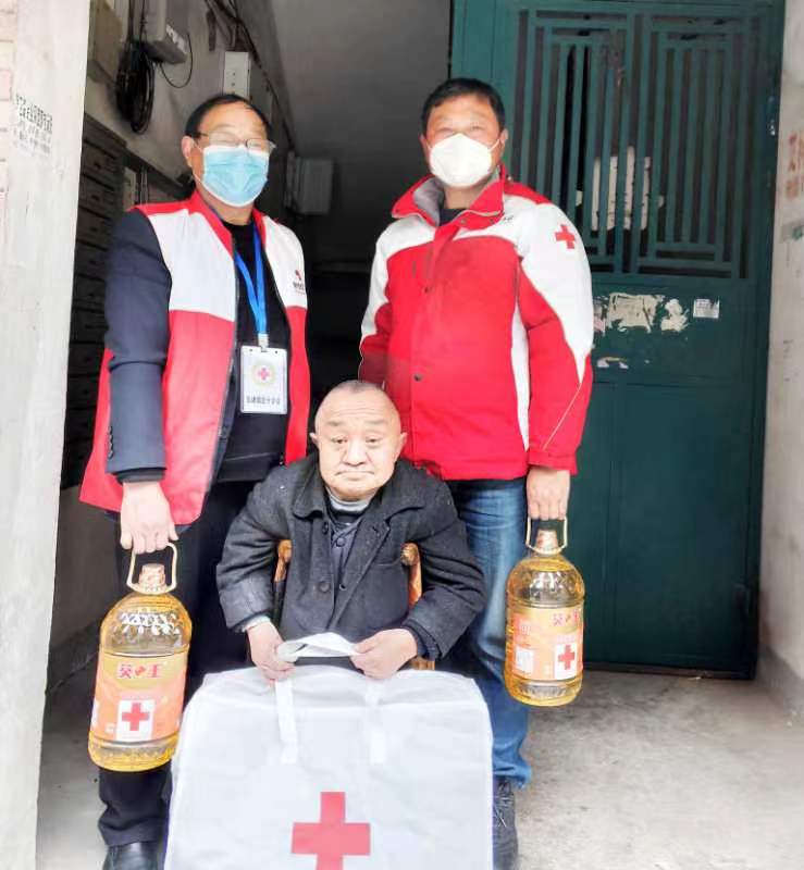 来到尿毒症患者姜某家中,正巧姜某感染新冠又入住宜兴人民医院,他爱人听说市、镇红十字会领导来家走访慰问,特地从医院赶回家中。胡秘书长详细听取了姜某的病情,鼓励他们注意身体,争取早日战胜病魔。并向他们送上食用油、被褥和2000元慰问金,祝福他们春节快乐,身体健康!