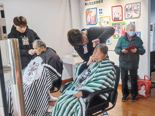 当天天气阴冷,寒意沁人,但在博爱家园的理发室内,却是春意融融。来自文峰美发有限公司的三名红十字志愿者,正为前来的10多位居民提供义务理发服务。居民们纷纷说:“理发室今天重新开张,说明疫情向好,我们才能放心来理发。”家在附近的老孙头在博爱家园接受理发服务已多年,他看到翘首以盼的红十字志愿者,内心非常高兴。老孙头说:“这次理发等了好久。这些志愿者服务态度好,理的发也有款有型,让我十分满意。”