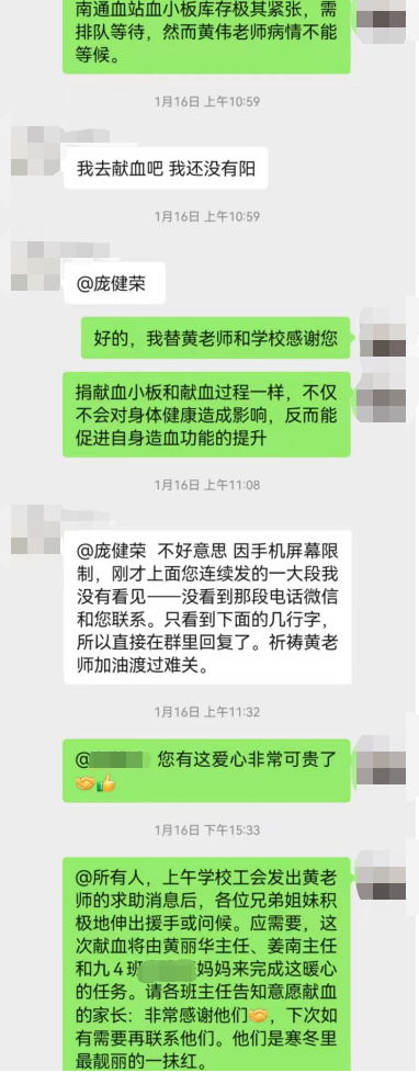 事情要追溯到1月16日启东市开发区中学副校长、工会主席庞健荣接到了一个求助电话“实在是没有办法了,想请你们同事看看能不能救救她?”庞健荣安慰道“别着急,我们学校永远是黄老师坚实的后盾。”打来求助电话的是该校黄伟老师的爱人朱兴东,黄伟因身患重病已住院大半年,由于治疗产生的副作用急需血小板,而南通血站库存十分紧张,情急之下朱兴东想到向爱人的同事们求助,但血小板的捐献条件严苛,捐献者先要进行检测,达到规定的各项指标后才能进行捐献,庞健荣立刻在学校工作群里、家长群呼吁转发“希望多几个符合条件的人一起去,增加命中率。”