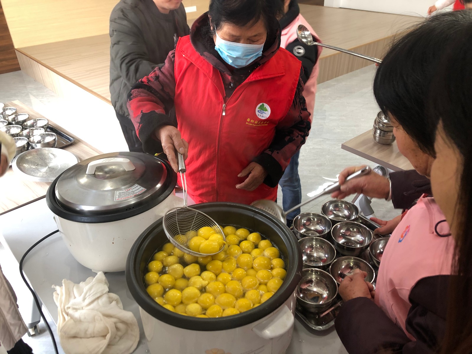 活动在热闹的《新年好》歌声中开始,志愿者通过PPT形式讲述元宵节的起源、习俗等,介绍元宵文化,发放健康小知识宣传页共同感受节日氛围。红十字工作人员为大家送去新春的祝福,一起为社区老人烧制美味的元宵,不一会儿多彩胖胖的汤圆分碗摆放在桌子上。社区领导、志愿者们把一碗碗浓浓爱意的元宵端给环卫工人、社区居民,大家都开心极了。
