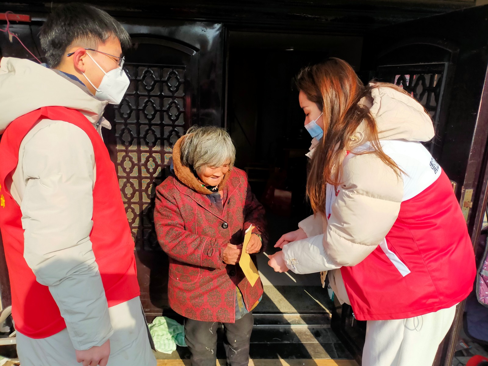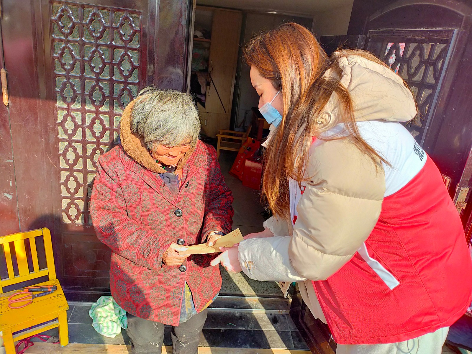 为让困难户过上一个欢乐祥和的春节,1月18日,杭州路社区博爱家园工作人员为单树兰送上来自红十字会的祝福。