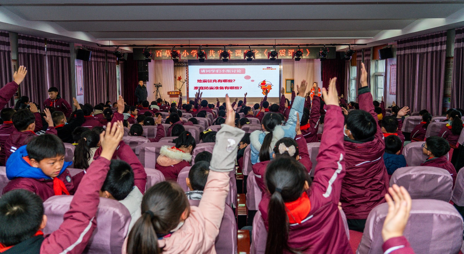 在百草园小学的报告厅内,来自恐龙园集团的公共安全讲师正在向228名五年级的学生科普地震知识和防避技巧。