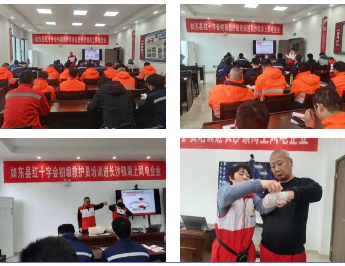 2月21日,如东县红十字会又举办了一期海上风电企业专场救护员(初级)培训班,来自中广核新能源南通有限公司、江苏国信风力发电有限公司、江苏新能海力海上风力发电有限公司、国电投南通新能源有限公司、三峡新能源海上风电江苏有限公司如东(柔直)项目部、景泰风电科技有限公司6家企业共50余人参加了培训。县融媒体中心“直通民生”栏目记者现场跟踪报道。