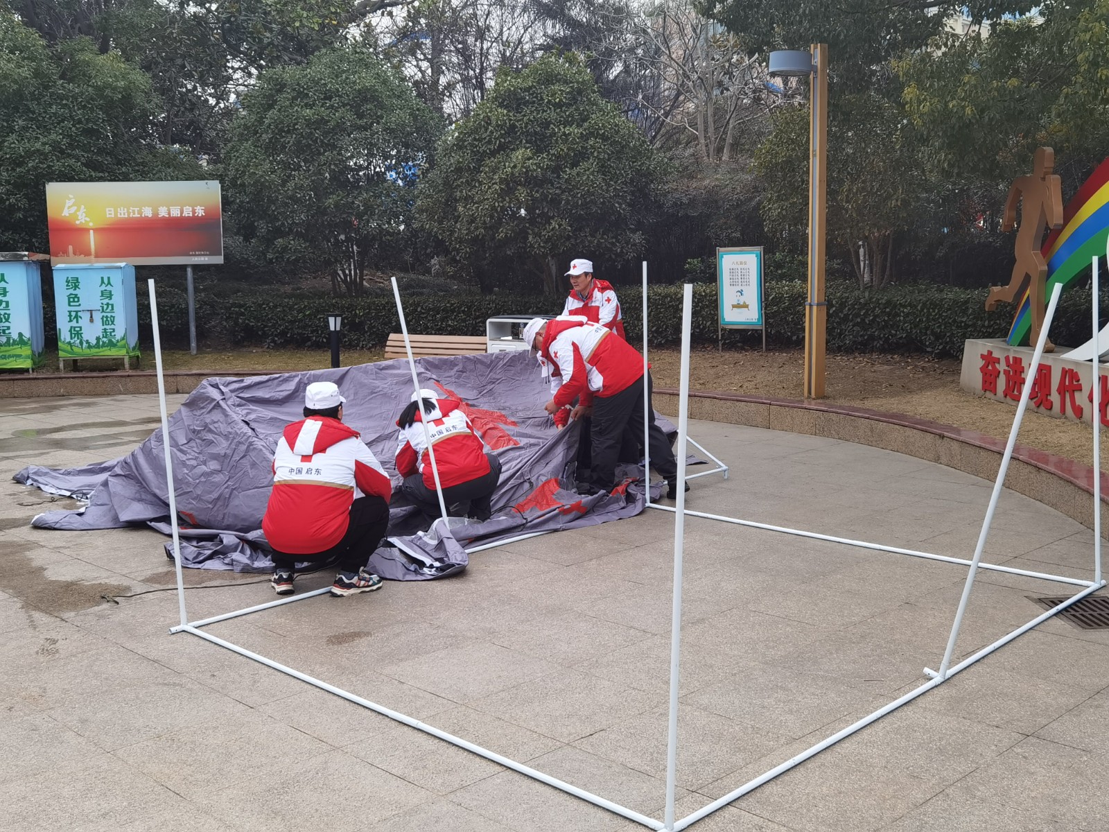 启东市红十字赈济救援队队员积极开展搭建帐篷工作,讲解示范心肺复苏等急救技能,并指导群众进行实际操作。