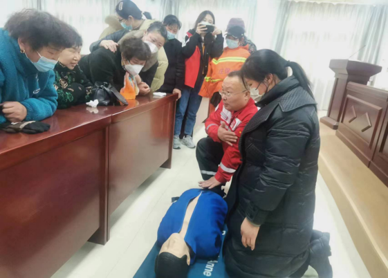 讲座过程中,区红十字会救援队队长、救护培训师资王强通过线上视频和线下实操相结合的方式,为居民们讲解了“脑卒中”的识别与急救、气道异物梗塞、心肺复苏以及AED使用,完整演示了应急救护的全过程。随后,王老师手把手指导居民亲身体验心肺复苏和AED急救过程,通过简洁、生动的培训方式,使受训的工作人员了解了急救的基本要领,当遇到突发状况时能够正确应对,科学做到“第一施救”。