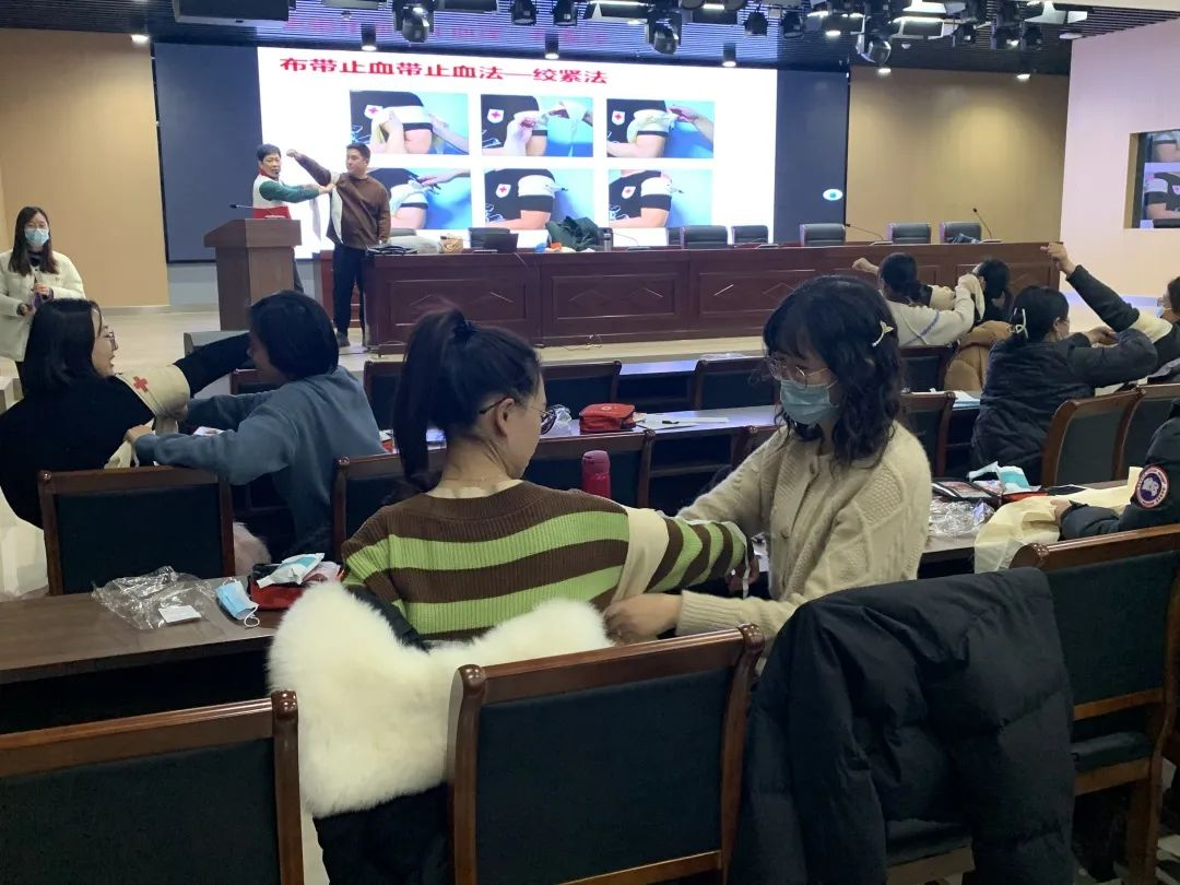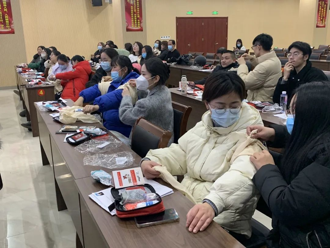 本次培训着重讲解了气道异物梗阻现场急救方法(包括自救与他救)、心肺复苏的操作流程、AED的使用方法、创伤急救、止血包扎的理论知识。