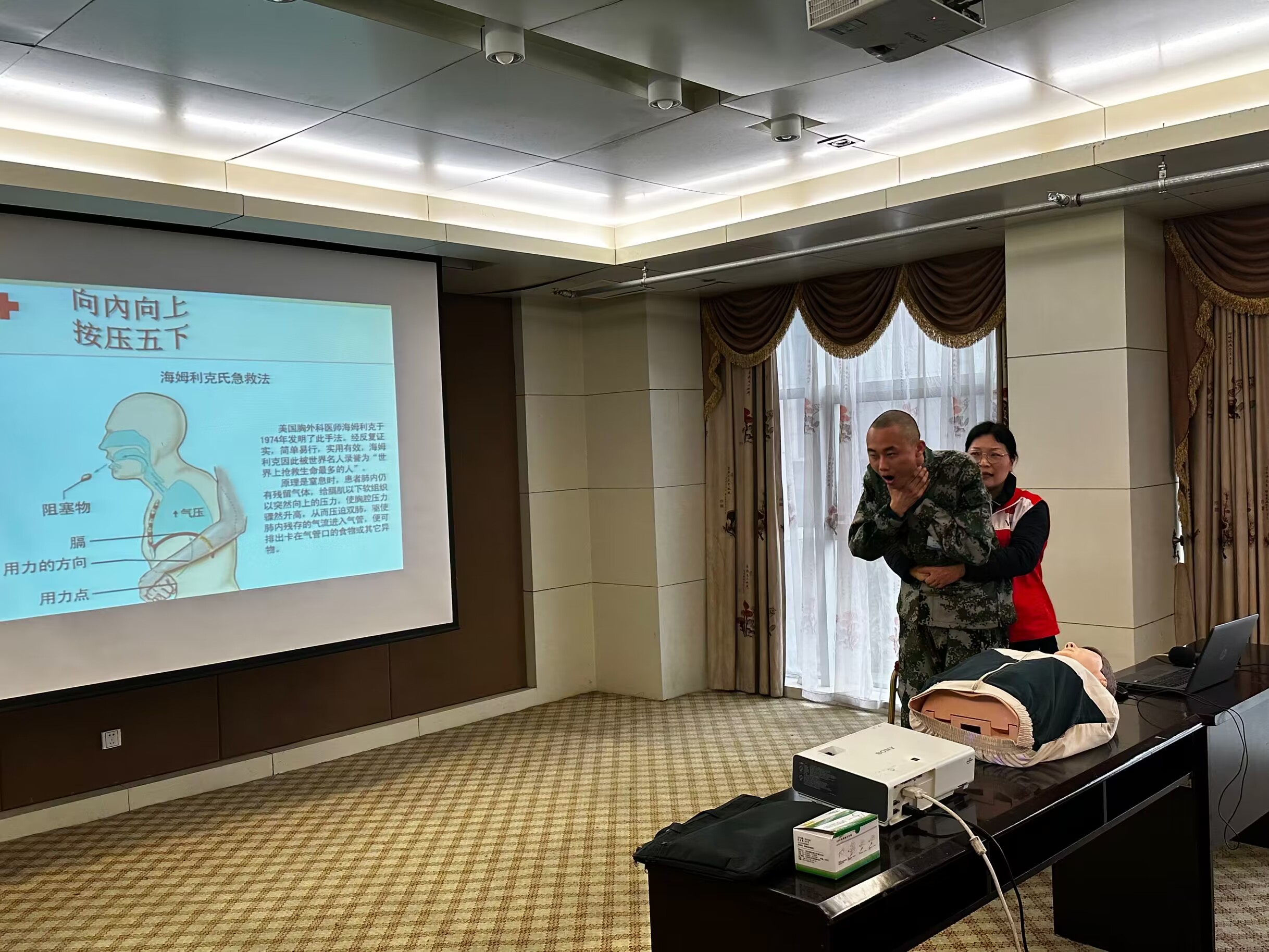 培训过程中,红十字救护师资采取理论知识教授与救护技能实际操作相结合的方式,对参训学员讲解了为什么学习心肺复苏,如何判断意识丧失、心跳骤停和如何做好心肺复苏等三个关键问题,以及如何进行及时有效的呼救、报警和协助救援等相关知识,并利用模拟人进行了操作演示,并对气道异物梗阻急救等进行手把手指导教学,学员们在训练中不断巩固学习内容,提升实际操作能力。