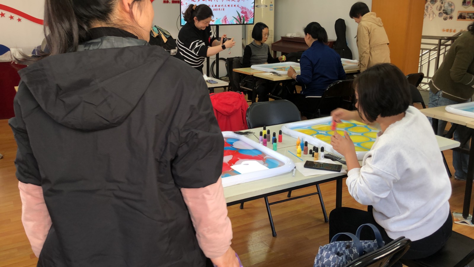 活动现场,大家通过社区提供的短视频了解扎染工艺的基本知识、扎染特点和制作技巧的教学,带领大家走进古法扎染。在亲手制作环节,学员们开启了扎染艺术体验之旅,按照视频的讲解、示范,充分发挥自己的想象,在布染上自己喜欢的颜色,用梳子、夹子、木棍勾勒设计自己喜欢的图案,忙得不亦乐乎。