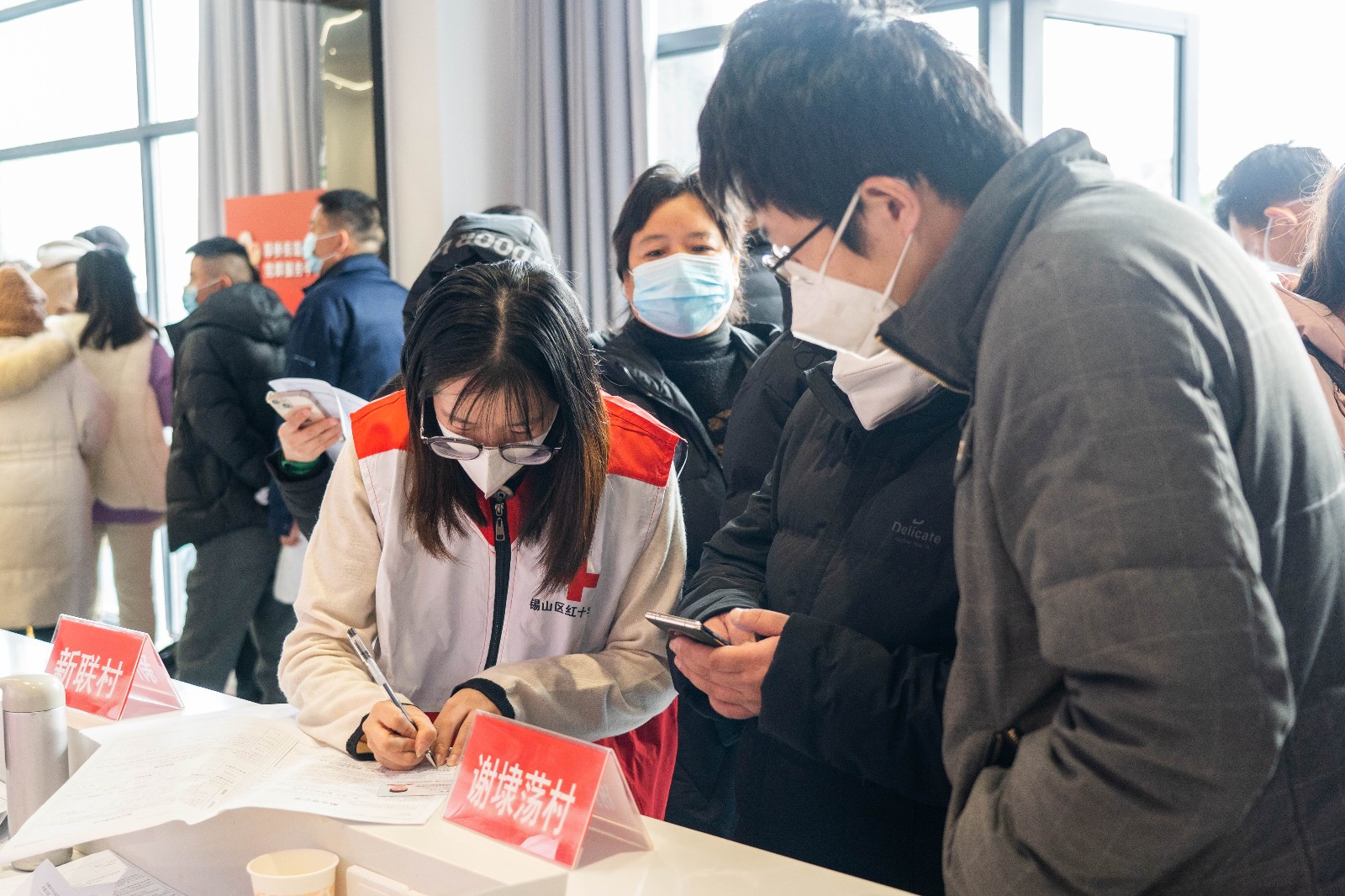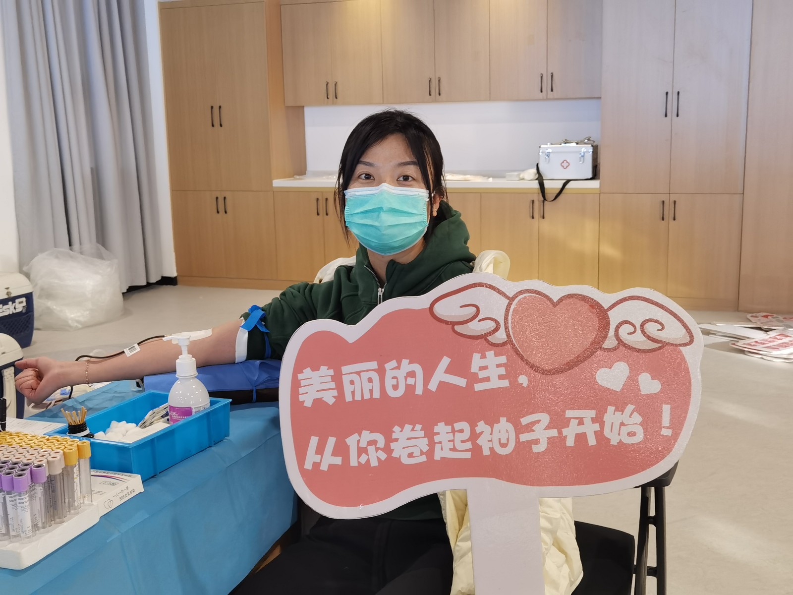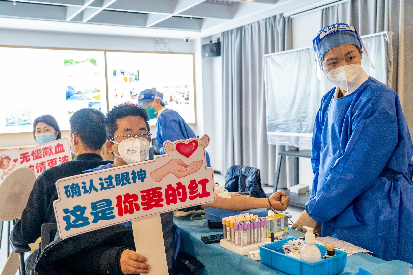 活动中,无偿献血志愿者在工作人员的指引下,有序填写无偿献血表格、测量身体指标。检查后,符合条件的志愿者在采血处等待献血,献血结束后到休息区等待结果,补充能量。