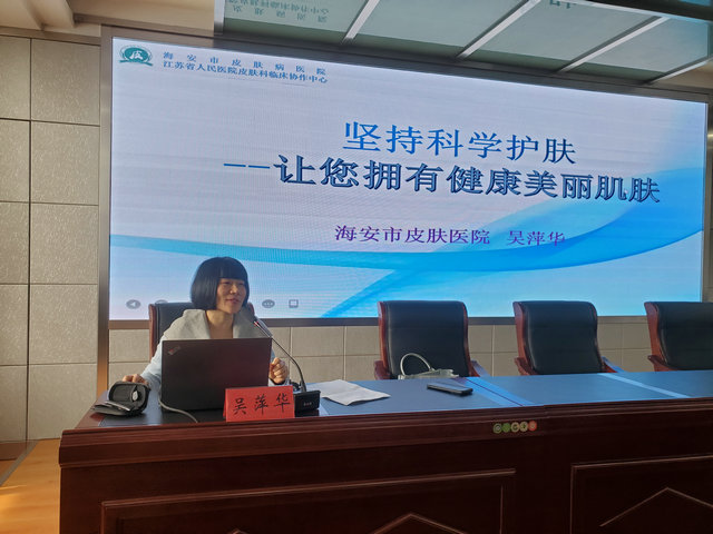 吴萍华作为江苏省抗衰老协会皮肤再生与修复分会委员、南通市医师协会皮肤性病科医师分会常务委员,她以《坚持科学护肤--让您拥有健康美丽肌肤》为题,采用问答形式,从健康皮肤分类、护肤步骤、护肤品选择等方面指导大家进行科学护肤。