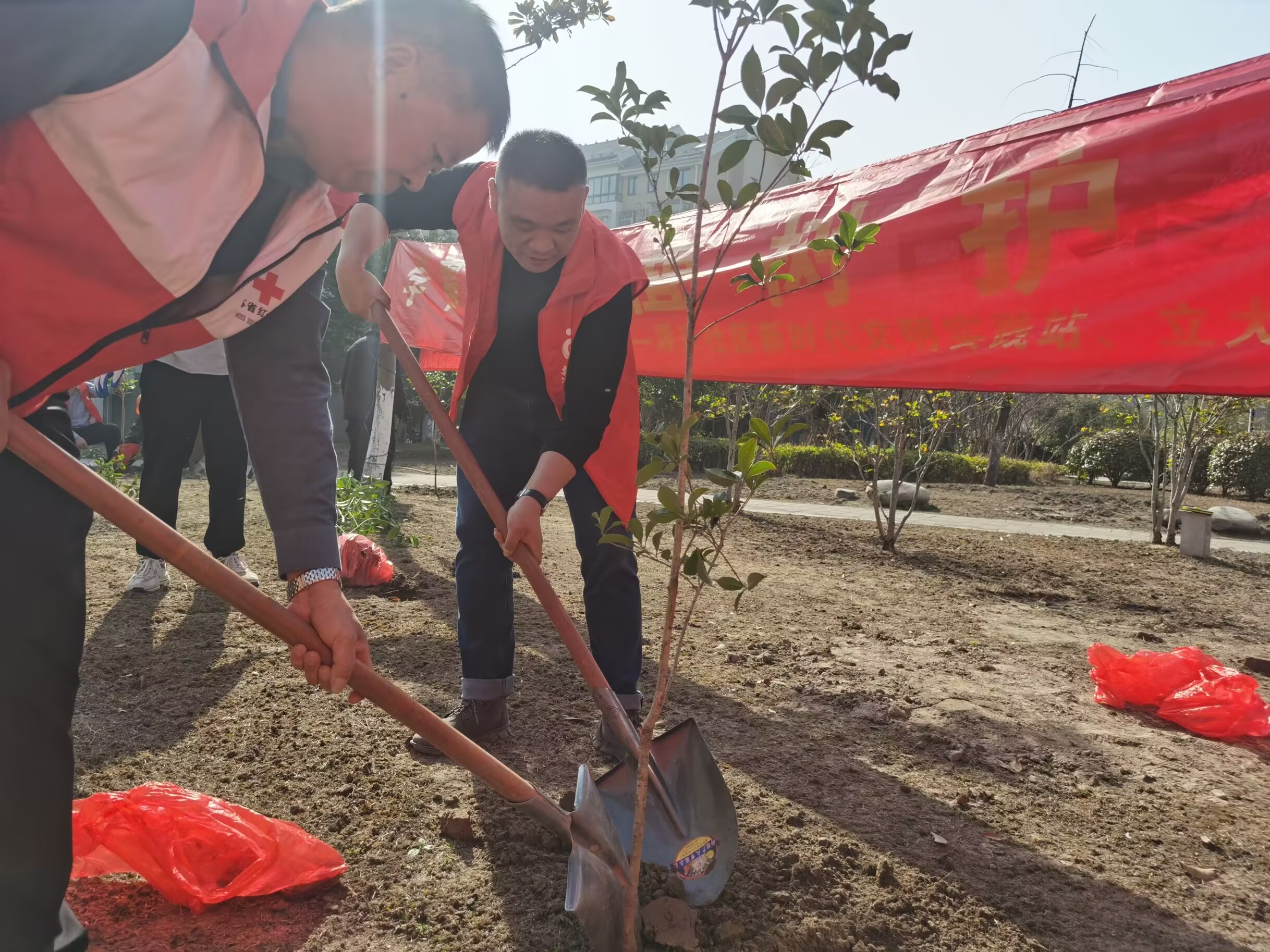 活动中,大家干劲十足。红十字博爱家园志愿者们按照分工来到源兴花苑植树基地,相互配合挥锹培土、放苗扶正、踩实浇水。一小时内30棵桂花树“昂然挺立”在土壤里。