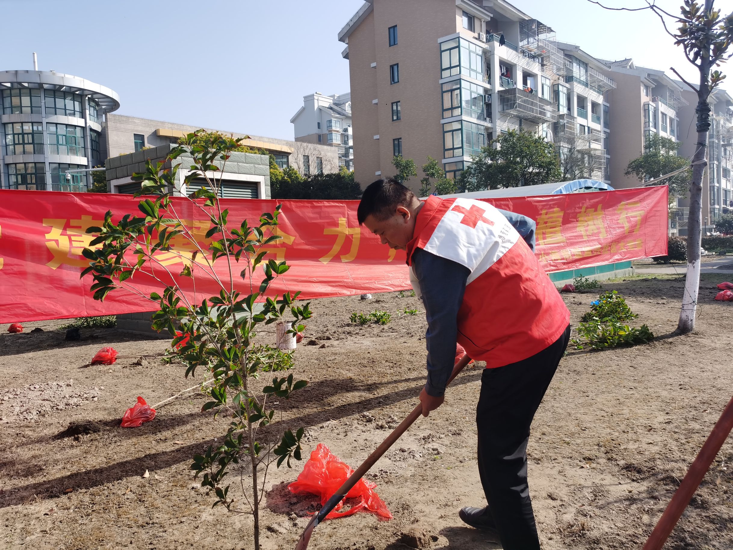 [南通市](南通市开发区红会):源兴社区红十字博爱家园:党建聚合力 生态植树行