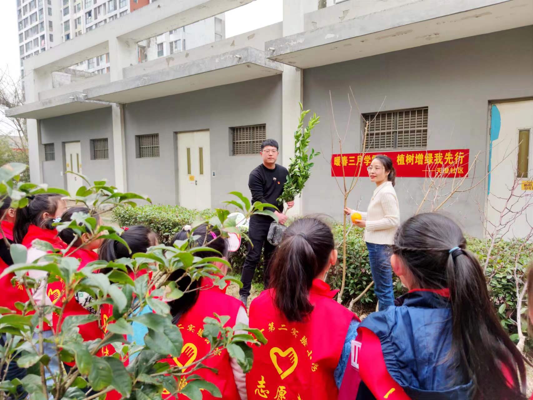 活动现场,社区工作人员带头干、引着干,党员代表、红十字志愿者代表们也热情高涨,干劲十足,或背苗散苗,或扶苗挖坑,或填土夯实,或提桶浇水,或挥锨扬镐,吆喝声交织着铁器声奏响了绿色的主旋律,现场一片热火朝天的劳动景象。来自天一实验小学的孩子们也相互配合,扶苗、填土、踩实……各个环节衔接有序,配合默契,合力栽下一株株新树,彰显了社区团结协作、昂扬向上的精神风貌。
