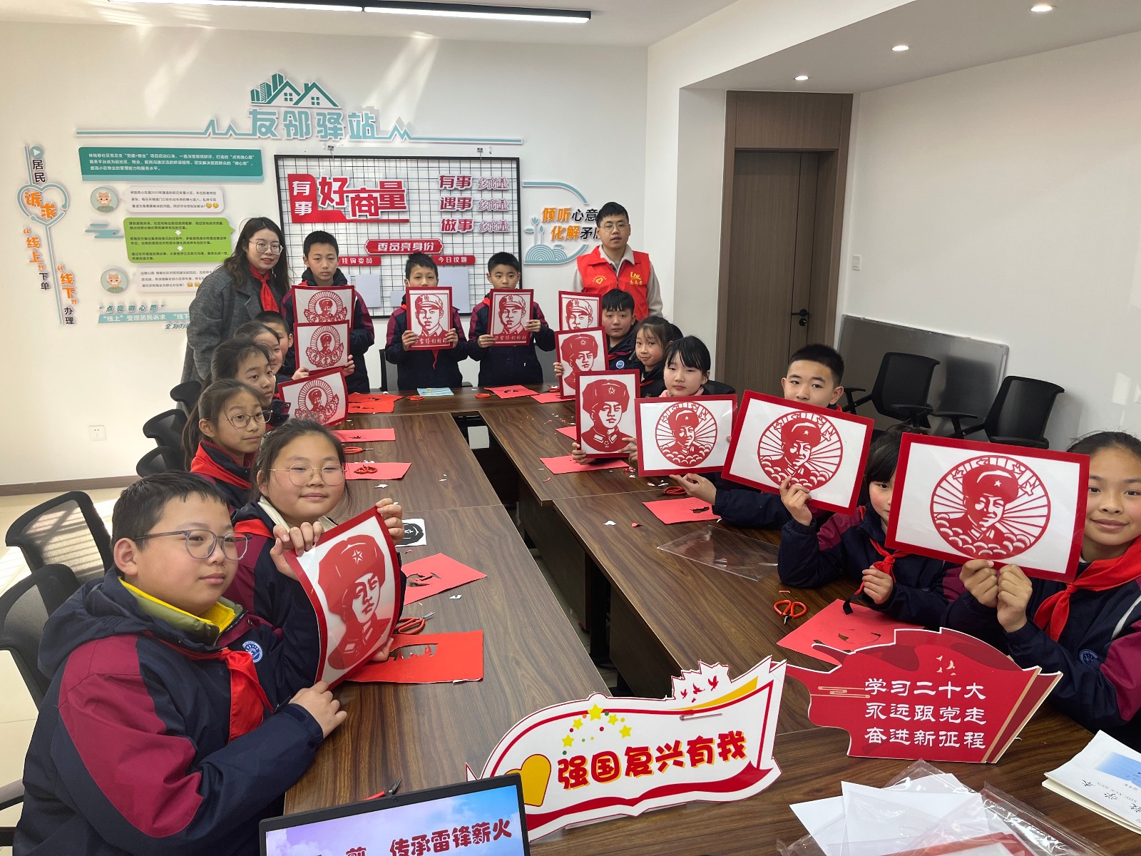 当辅导员季澄璐老师在班级里讲了李士路叔叔的事迹后,队员们都很触动。队员们还在社区工作人员的组织下,在一张张红底纸上,渲染出一副副惟妙惟肖的雷锋叔叔剪影。队员沈凌啸感慨今天听完李士路叔叔的事迹后,已经身处幸福之中,作为雷锋中队的一员,我更加应该严于律己,帮助他人,争做学校的小小雷锋。