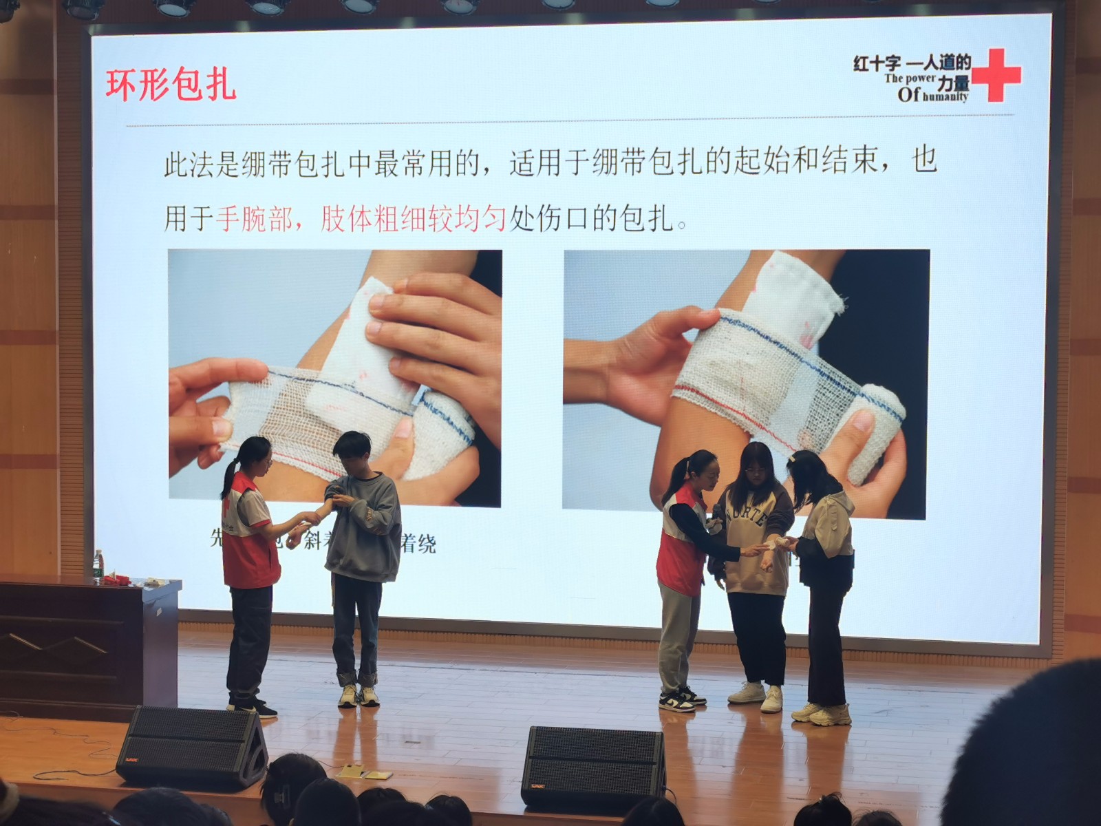 课程中,为了更好地讲解救护知识,老师们利用模拟人对心肺复苏进行了规范、标准的实操示范,细致讲解了CPR(心肺复苏)和AED(自动体外除颤仪)的操作流程及注意事项、气道异物梗阻抢救成功的关键以及止血包扎、烫伤烧伤的处理方法等内容。